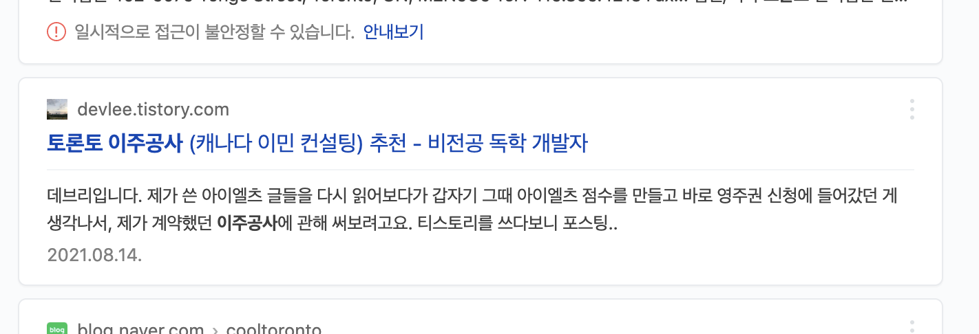 제가 직접 네이버에서 '토론토 이주공사' 라는 키워드로 검색해보니, 통합웹 두번째 페이지에 제 글이 뜨더라구요. 키워드를 잘 잡아서 사람들이 관심은 있지만 아직 많이 언급되지 않은 주제로 글을 쓴다면 네이버에서도 앞쪽에 노출될 수 있는 가능성이 높다는 걸 알게 되었어요!