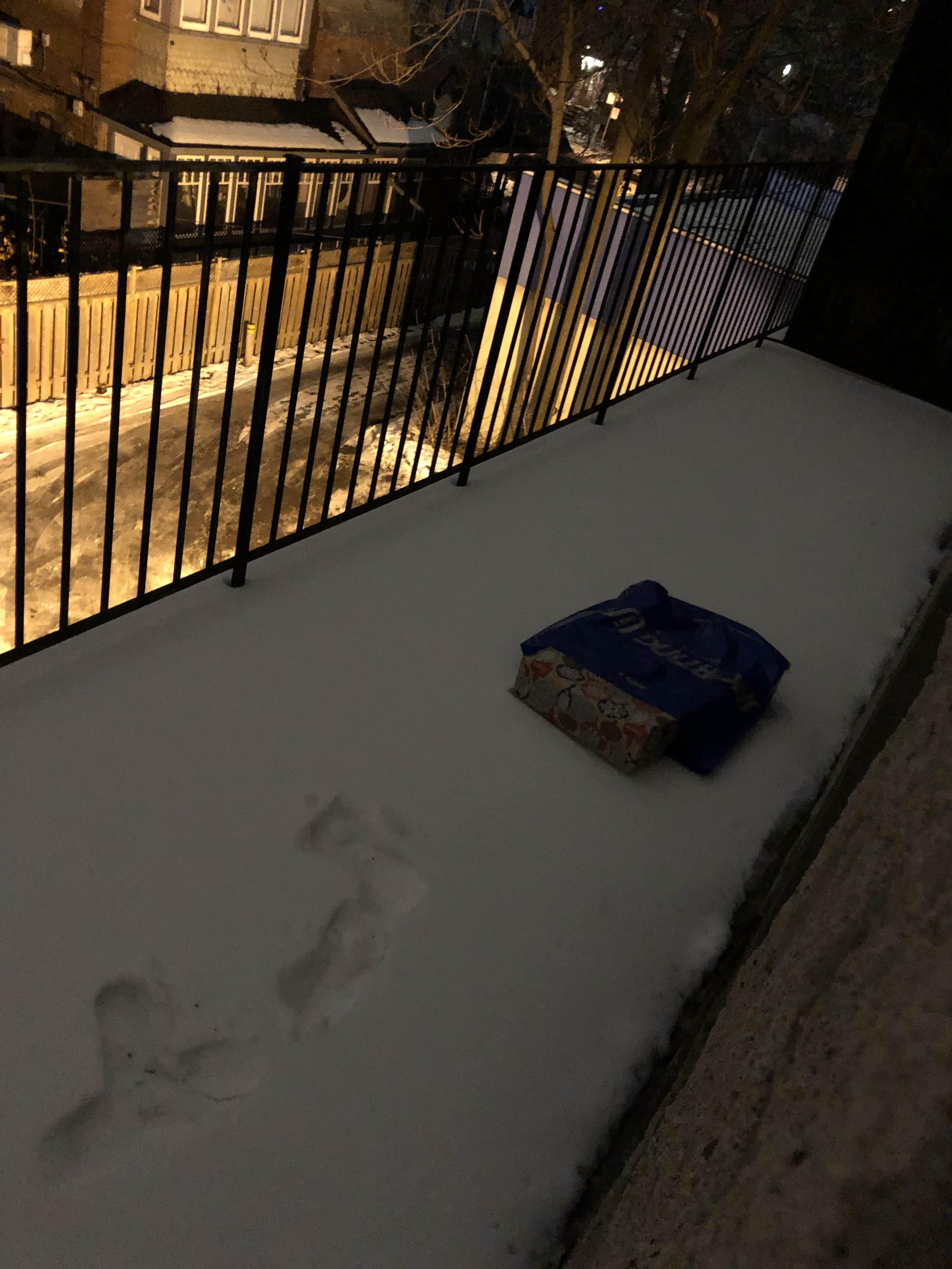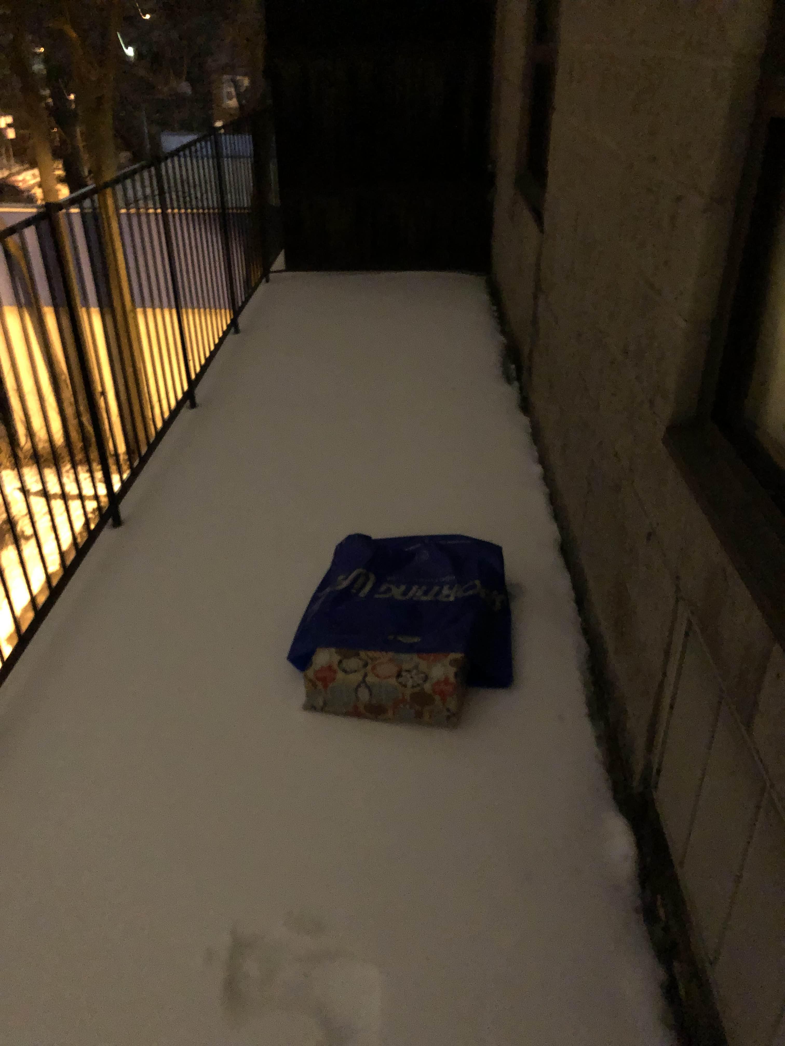 크리스마스가 가까웠던 어느날. 파트타임하고 밤늦게 들어왔더니 발코니에 산타가 다녀갔네요. 집주인이 집에 없어서 주차장에서 발코니로 크리스마스 선물을 던지고 간 산타님...