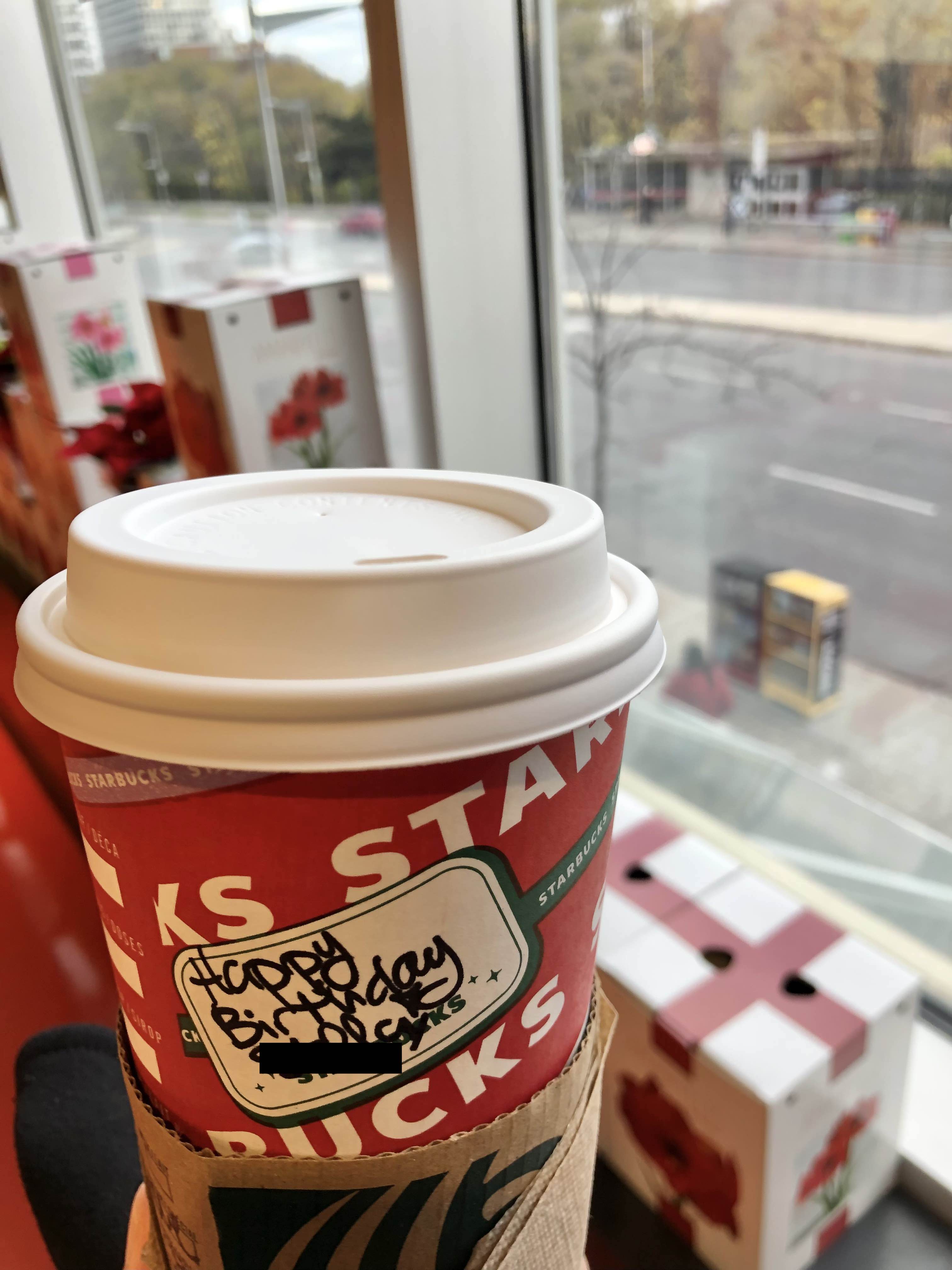 11월 말이었지만 생일날 공짜커피 마시러 집근처 큰 마트인 Loblaws 내 스타벅스에 갔는데, Loblaws 안에 있는 스타벅스라 생일기념 커피는 원래 제공되고 있지 않다고 하더라구요. 하지만 바리스타가 괜찮다며 그냥 만들어줄게 하더니 그 바쁜 와중에도 Happy Birthday 라고 적어줘서 감동 *-* 별거 아니지만 이런 사소한 것들 하나로 기분 좋은 하루를 시작하게 되더라구요 :) 이 커피를 마시며 집으로 걸어오는 내내 뭔가 마음이 따뜻했어요.