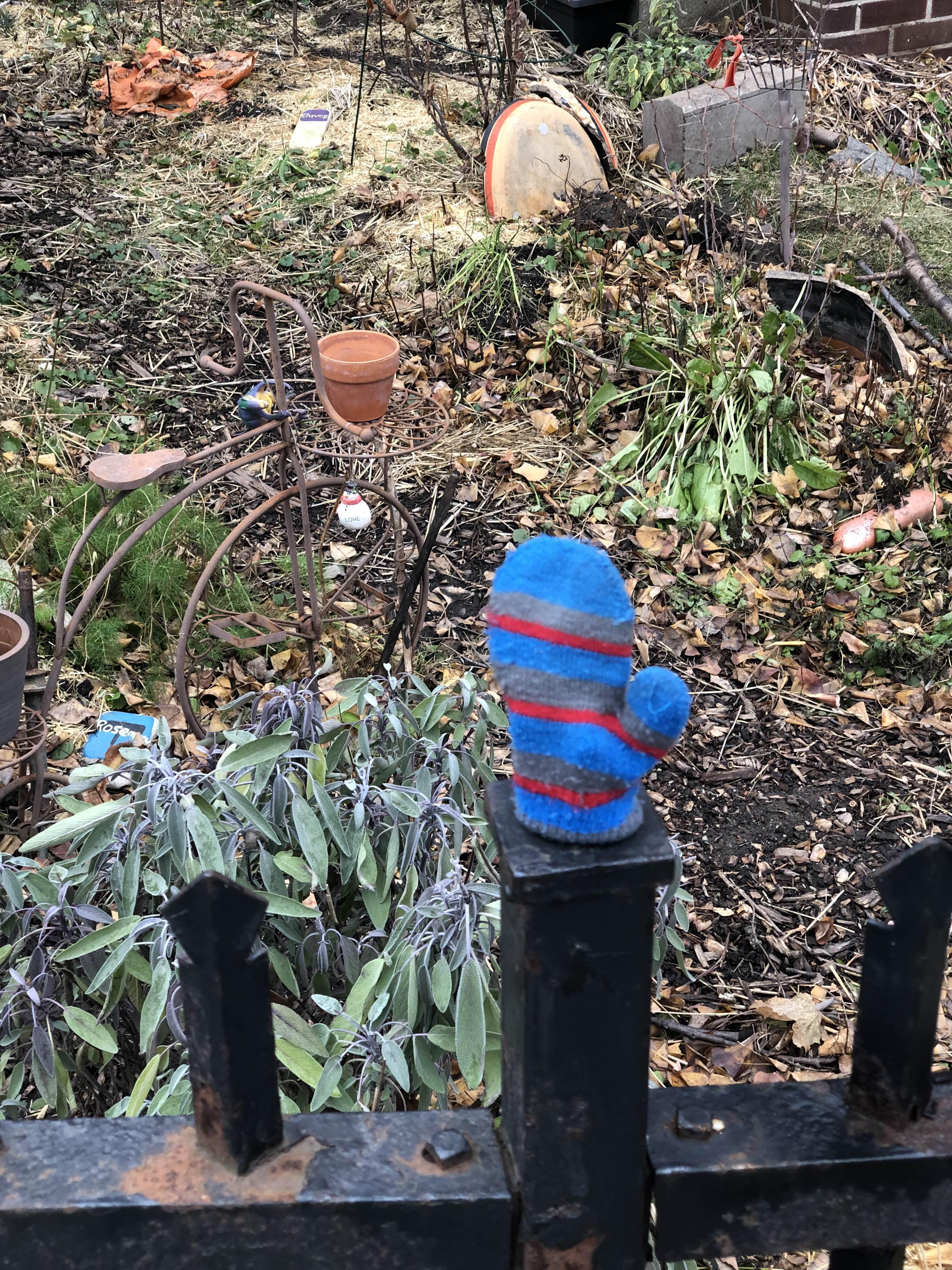 집 근처 교회 담장에 누군가 씌워두고 간 아기 장갑. 담장도 춥다 이거예요.