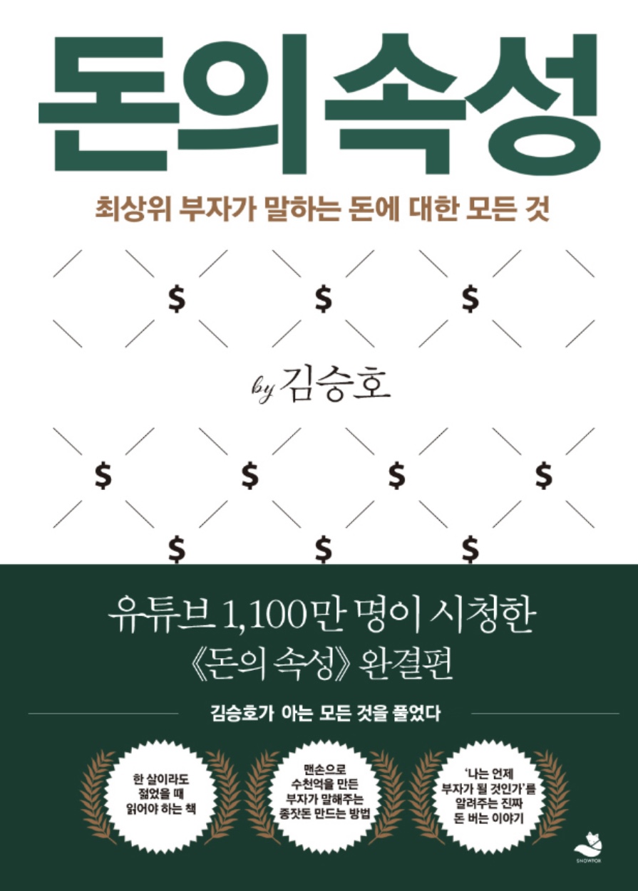저자 김승호 님도 모르고 1,100만 명이 시청했다는 유튜브 영상도 모르고 책 제목도 들어본 적이 없지만, 간단하게 검색해보고 관심이 생겨 읽기 시작했다가 3일에 걸쳐 나눠 읽고 방금 완독 했습니다. 저는 주로 어린 학생들도 읽고 이해할 수 있을 정도로 쉽게 쓰여진 로버트 기요사키의 <부자 아빠 가난한 아빠>, 브라운스톤의 <부의 인문학> 같은 쉬운 말로 쓰여진 재테크나 투자 관련 책을 좋아하는데, 이 책도 한 카테고리로 묶어서 보면 될 것 같아요. 다만 너무 돈에 치우치는 이야기라기보다는 전반적으로 인생을 살아가며 가져야 할 기본 인성과 마음가짐, 태도에 관해서 제가 정말 공감하는 이야기들이 많이 섞여 있어서 반갑게 읽었습니다.