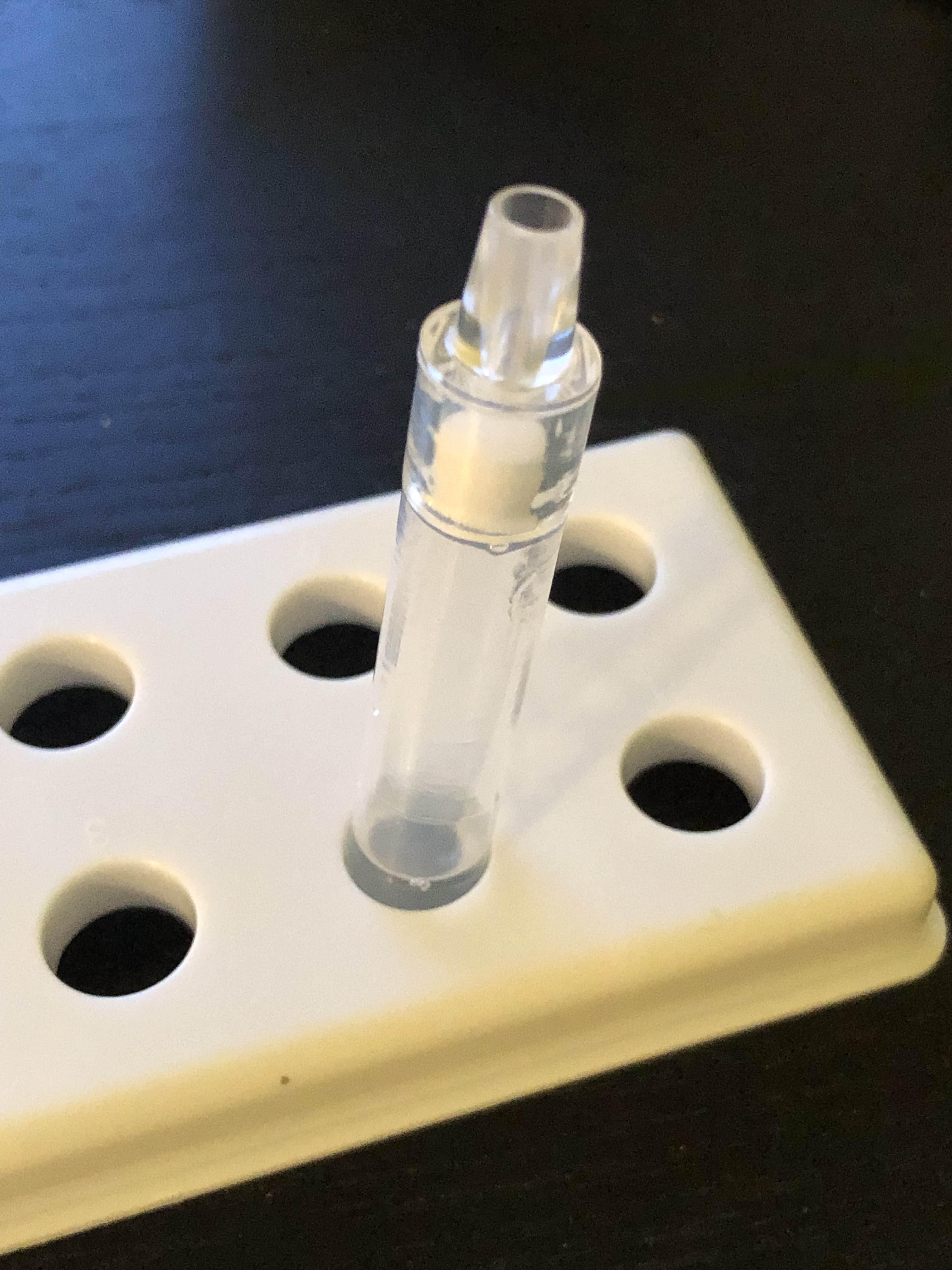 3. 면봉을 코에서 빼서 플라스틱 통에 든 액체에 2분 정도 담아두세요.