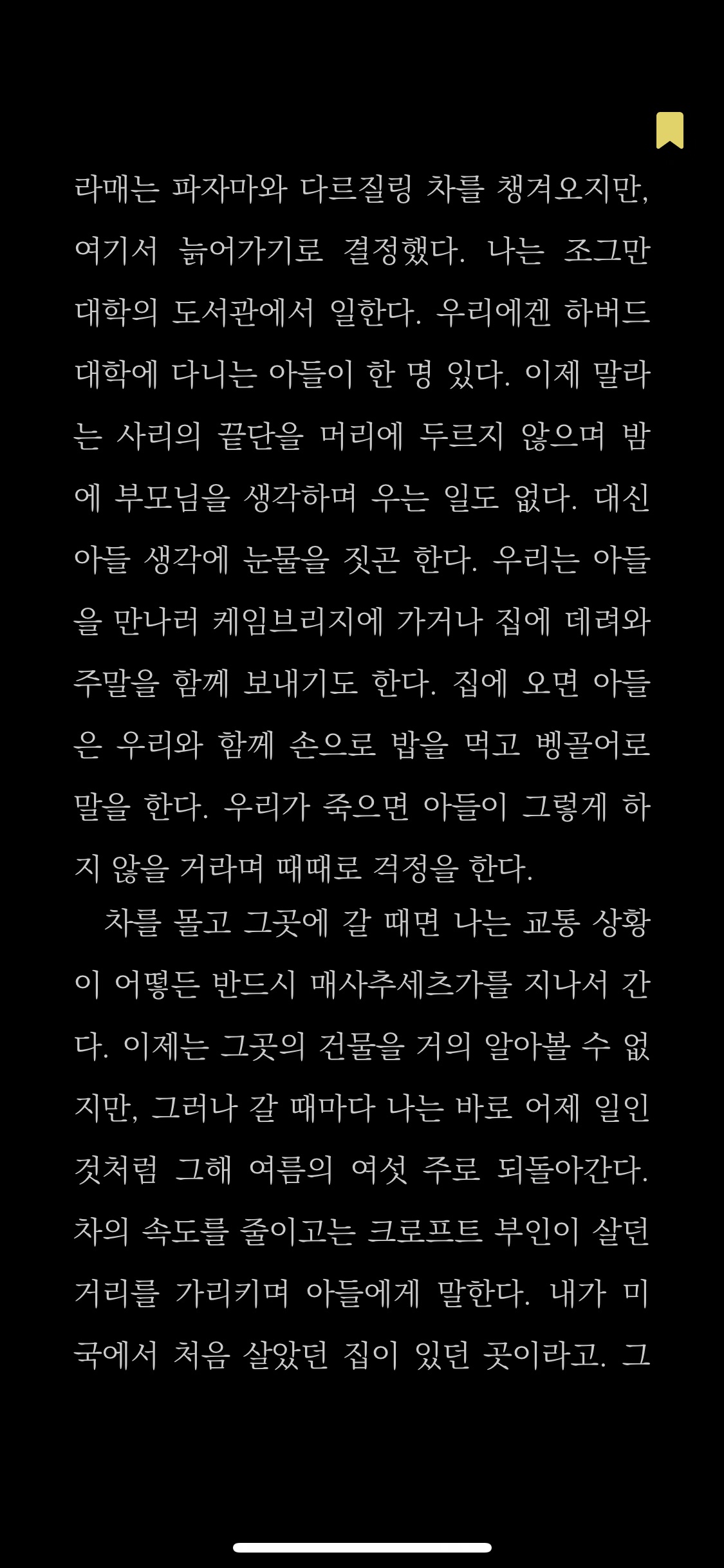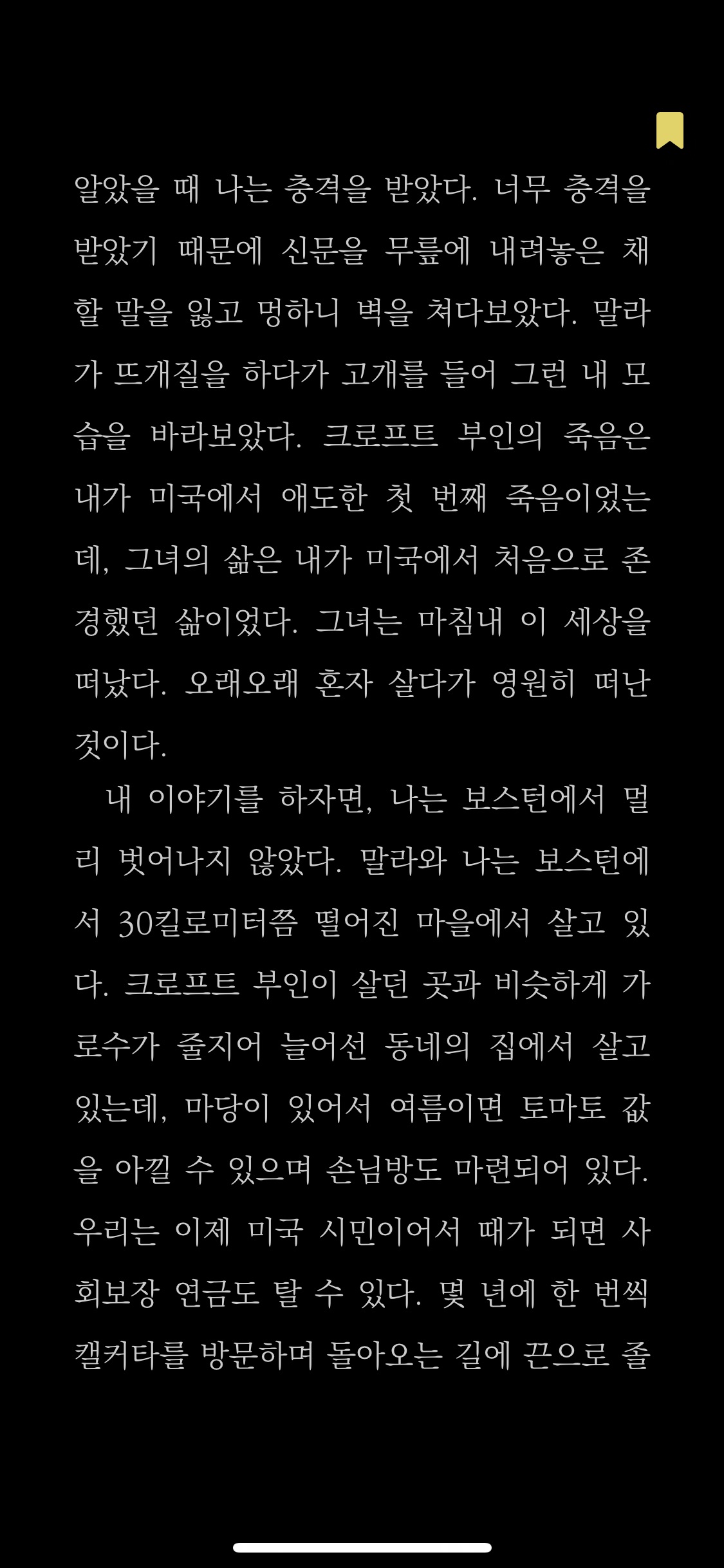 다만 여전히 캐나다에서 남은 인생을 살고 싶은지, 언젠가는 한국으로 돌아가고 싶은지를 확실하게 정하지 못한 내 입장에서는 한국으로 돌아가고 싶다는 마음으로 살짝 더 기울게 만들어버린 책이다. 여전히 나와 같은 고민을 안고 살아가고 있지만, 캐나다나 미국 등 이민한 나라에 머물 것을 어쩔 수 없이 결심한 분들은 줌파 라히리 소설을 멀리하시길. 분명 맘이 흔들리게 만들어버릴테니까ㅎㅎㅎ