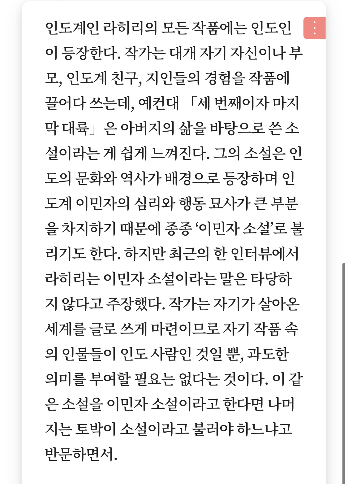 단편집인데 모두 인도계, 인도계 미국인들이 등장한다. 인도라는 나라와 인도인이나 문화에 대해 문외한인 나 같은 사람에게도 전혀 문제가 되지 않을 만큼 다루는 이야기는 전혀 한 문화에만 치우치지 않는 평범하고 일상적인 내용이다.