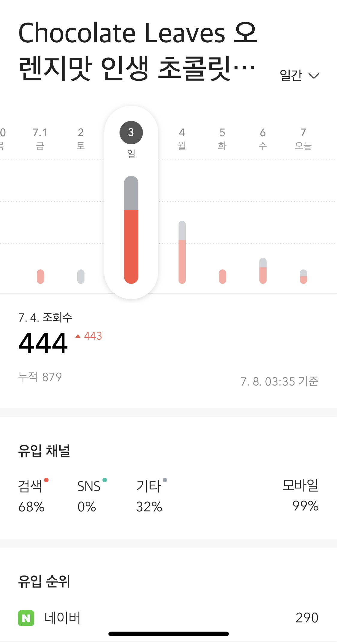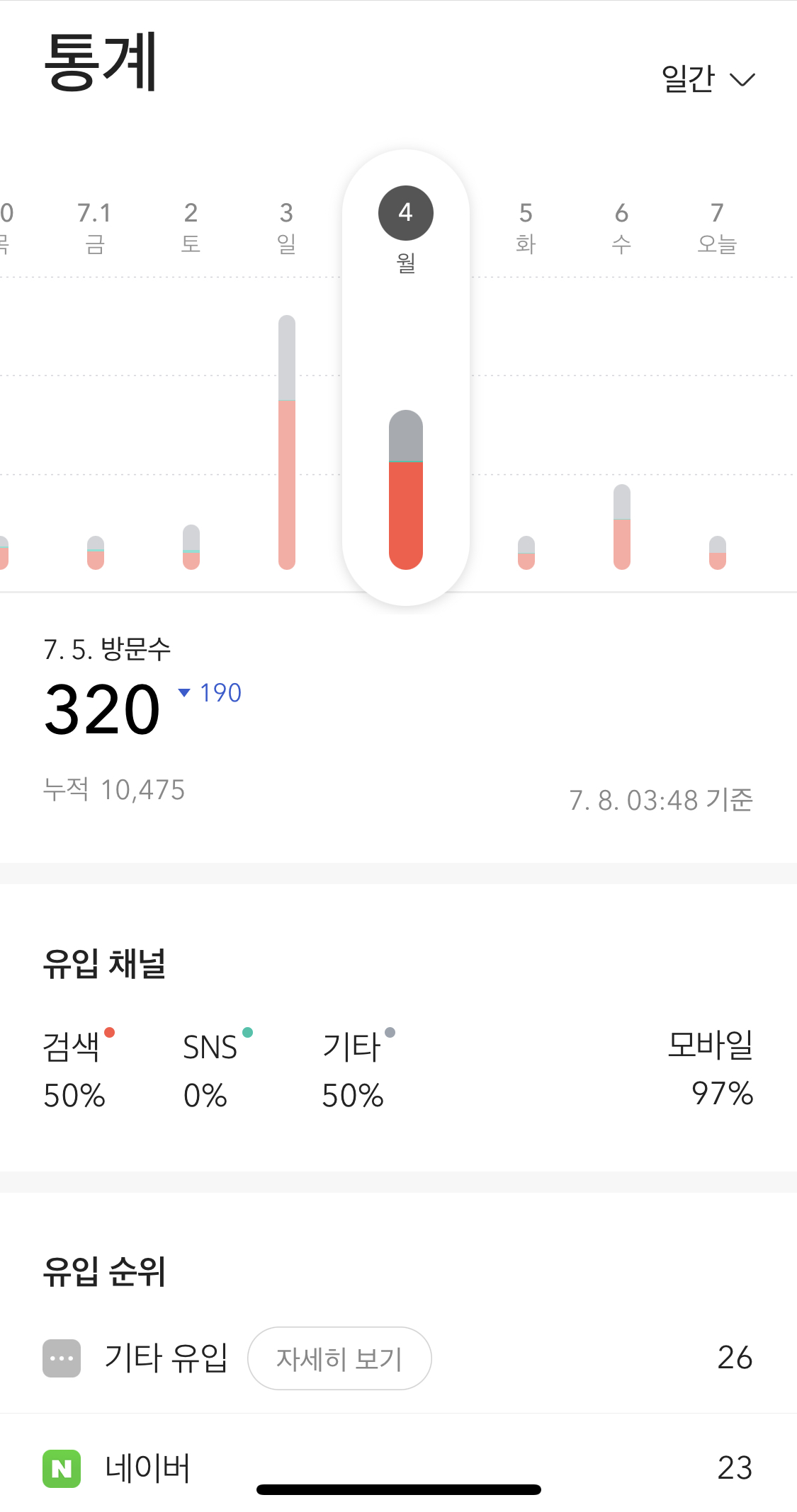 데브리입니다. 네이버에서도 검색이 가능하도록 웹마스터 등록을 해둔 건 한참 전이지만 실제로 네이버에서 키워드로 검색해서 유입된 적은 없었어요. 그런데 최근 며칠! 부쩍 네이버를 통해