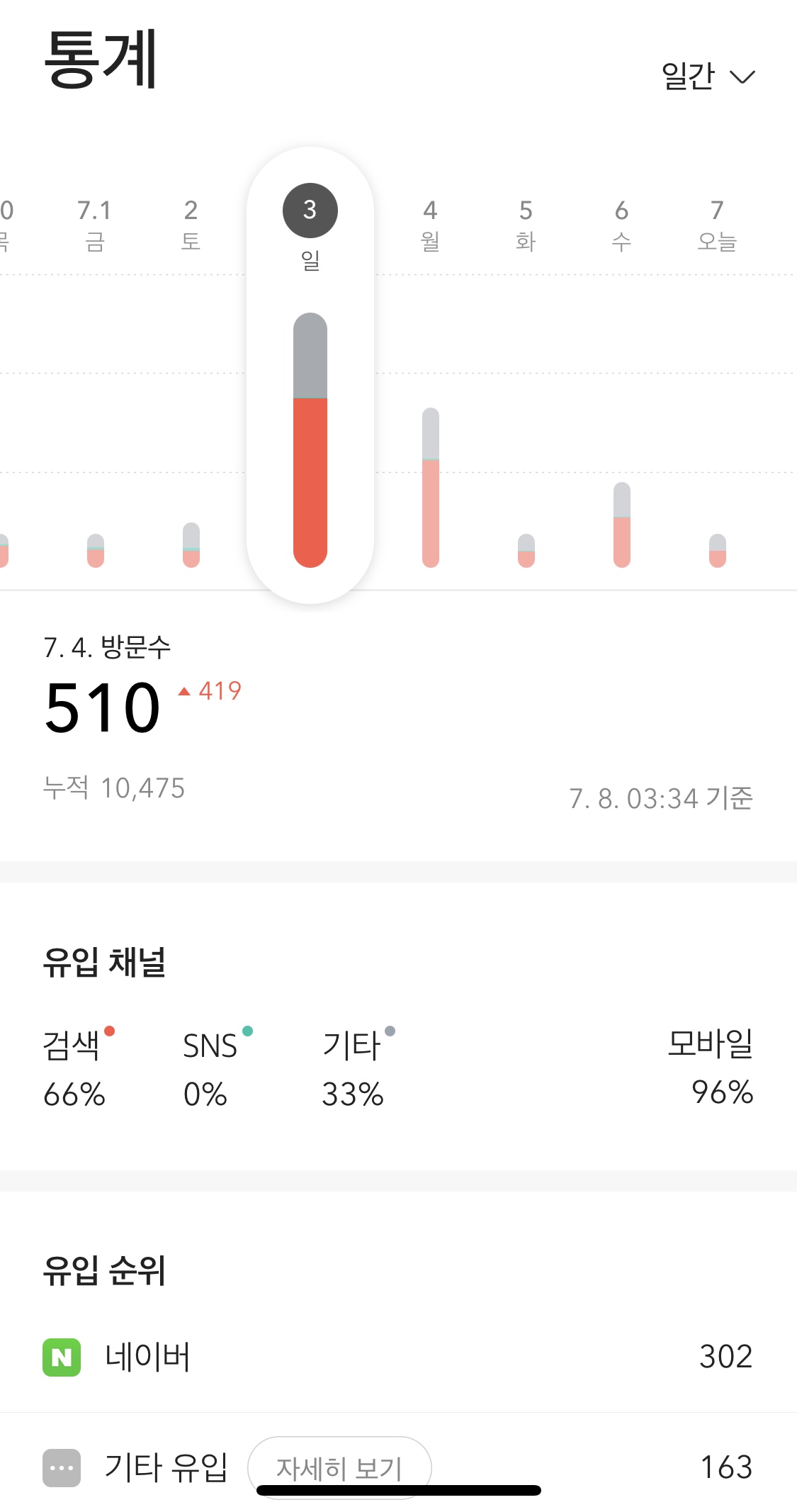 이 전에 써둔 글을 읽어보니 총 방문자 1만명을 만들기까지 6개월이라는 시간이 걸렸는데, 점점 성장하는 속도가 빨라지는 게 보이네요. 6개월마다 이렇게 통계를 기록하며 블로그가 커가는 모습을 기록해야겠어요!