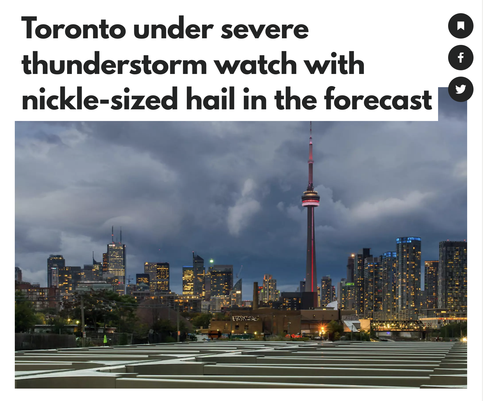 토론토에 사는 사람들이라면 거의 구독하고 있는 blogTO에서 Toronto under severe thunderstorm watch with nickle-sized hail in the forcast라는 글을 발견했어요.