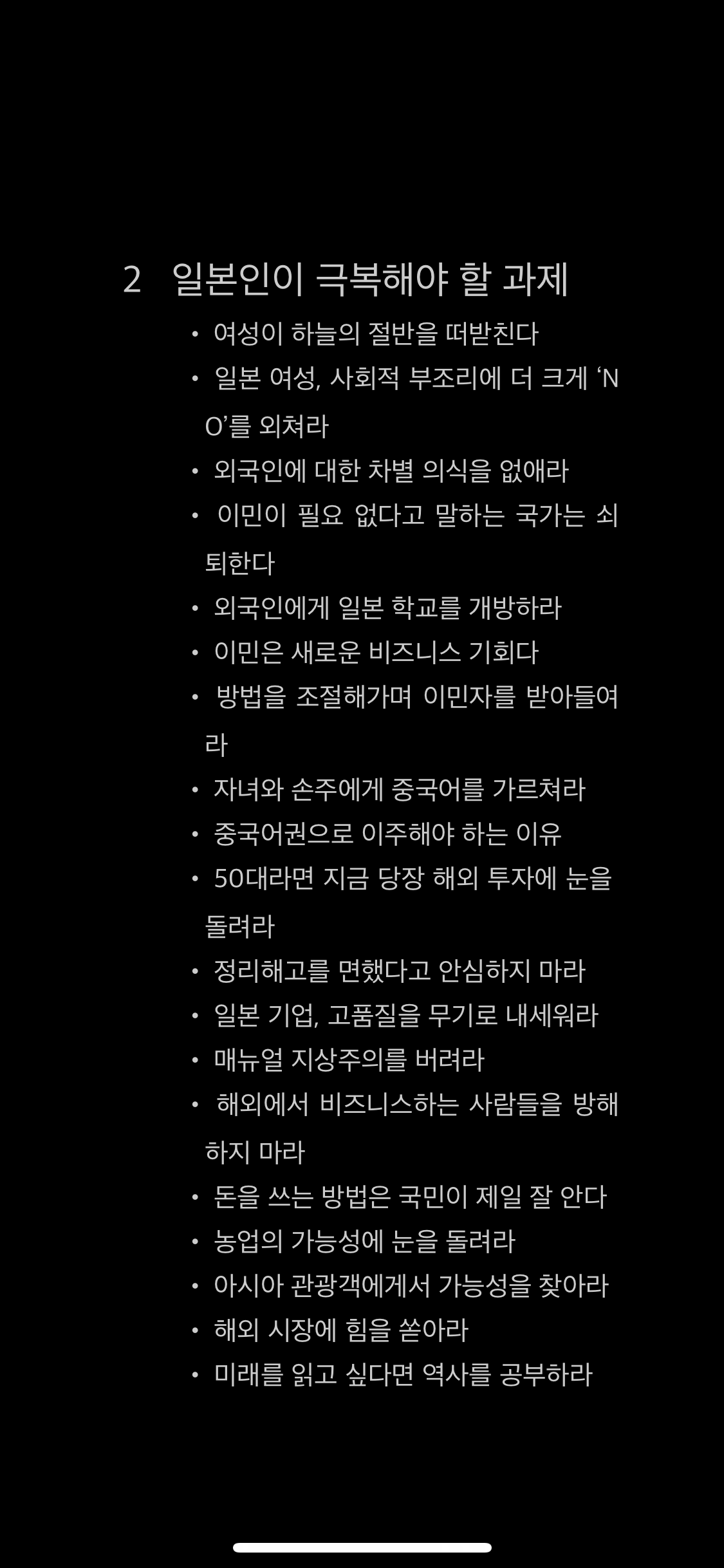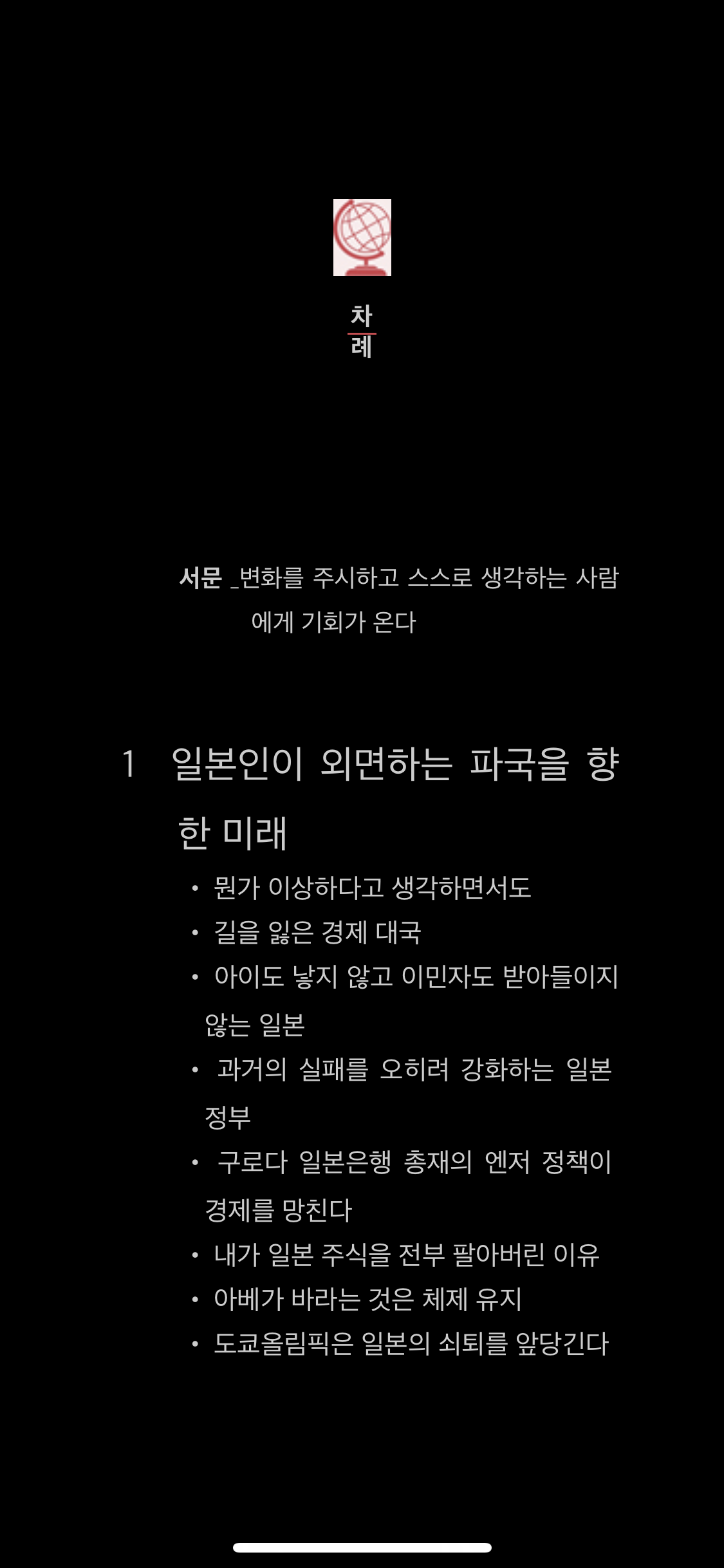 누군지는 몰랐어도 이 목차 앞부분만 훑어보고도 일본을 제대로 파악하고 있다는 걸 알 수 있었다. 1, 2장은 일본의 문제점과 대책에 관한 이야기이고 그 뒤로 한국에 관한 이야기 조금, 중국에 관한 이야기가 많이 나온다.