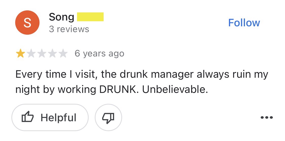 어느날 밤 우연히 오래전 주말마다 파트타임으로 일했던 레스토랑의 구글 리뷰를 발견했는데 100% 팩트라 소리내며 한참을 웃었어요. 이 매니져한테 이걸 보내줄까말까 고민하다 혼자 간직하기로...