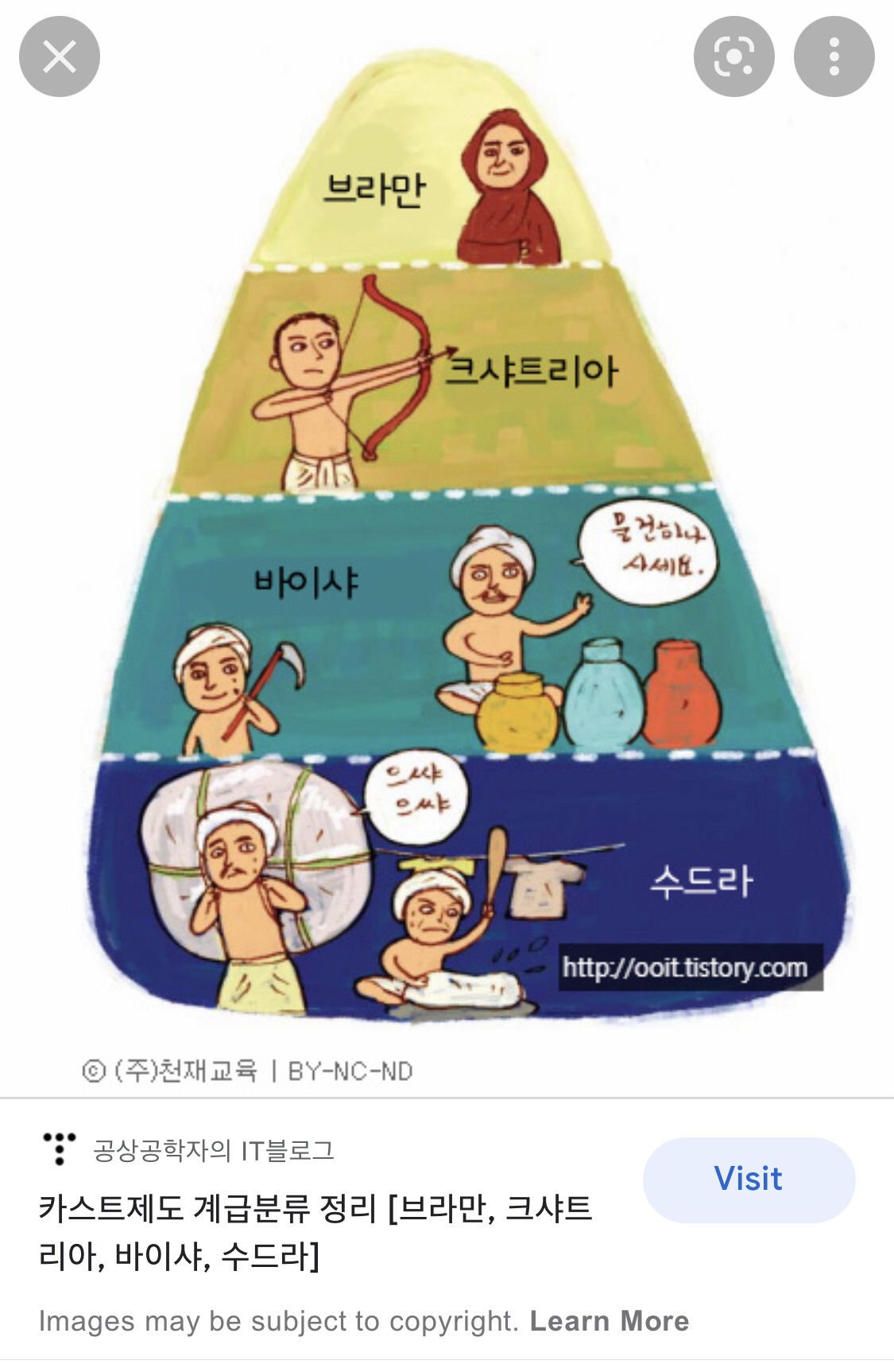 최근 몇달간 줌파 라히리에 꽂혀있는데 책을 읽다가 문득 궁금해진 인도 카스트제도의 계급을 누군가 이렇게 귀여운 그림으로 보기좋게 정리해두신 걸 발견했어요. [그저 좋은 사람]에 나온 단편들 중 하나에 미국 상류층들이 사는 동네를 가르키며 '여기가 미국의 브라만들이 사는 곳이야'라고 설명하는 부분이 나오거든요.