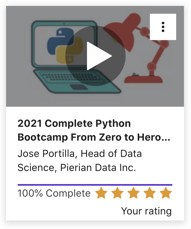 2019년 여름에 코딩에 대해 많이 검색해 본 후, 취미로 제일 처음 배워본 프로그래밍 언어가 파이썬이었습니다. 그중 리뷰가 가장 좋았던 Jose Portilla의 Complete Python Bootcamp From Zero to Hero를 여름부터 천천히 시작해서 겨울인 12월에 수료했답니다.