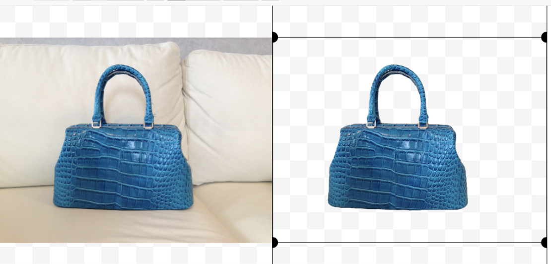 위 이미지와 같이 왼쪽이 배경 화면이 있는 채로 저장된 이미지 파일을 받았다면, 포토샵으로 오른쪽과 같이 배경을 없애고 가방만 남겨서 png 파일로 다시 저장하세요.
