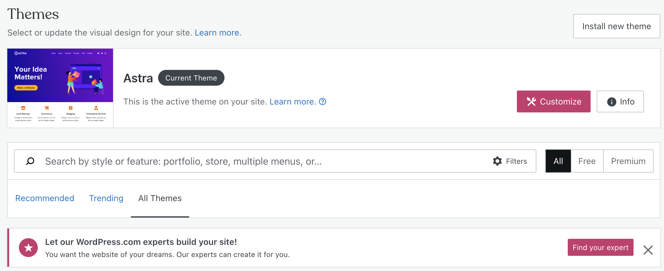 3. 미리 만들어진 Theme 중 Astra가 가장 괜찮은 것 같으니, 이것저것 다른 거 검색하거나 처음부터 하나하나 다 만들지 말고 무조건 Astra Theme에서 고르고 시작하기!!!