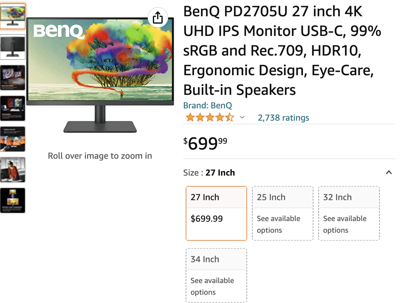 오랜 고민 끝에 저는 영상 편집 용도로는 거의 안 쓸테고, 코딩과 디자인 작업으로만 쓰기에는 화면이 너무 크면 오히려 집중력만 흐려지고 눈에도 안좋을 것 같아서 27인치로 구매했어요. 물론 주문하기 전에는 직접 오프라인 매장 (Best Buy)에 가서 27인치 vs 32인치 사이즈를 확인하고 27인치로 마음을 굳히기도 했구요.