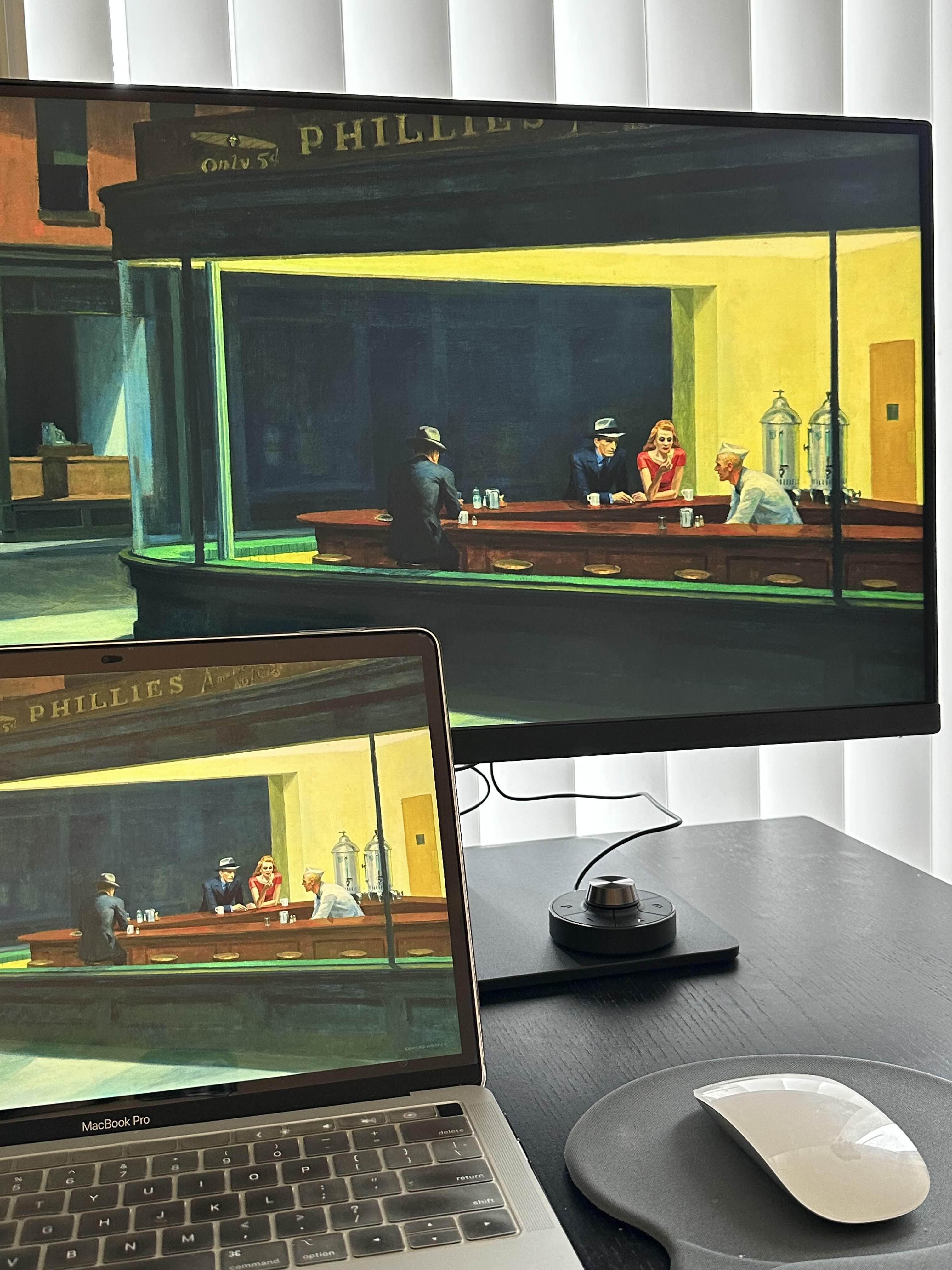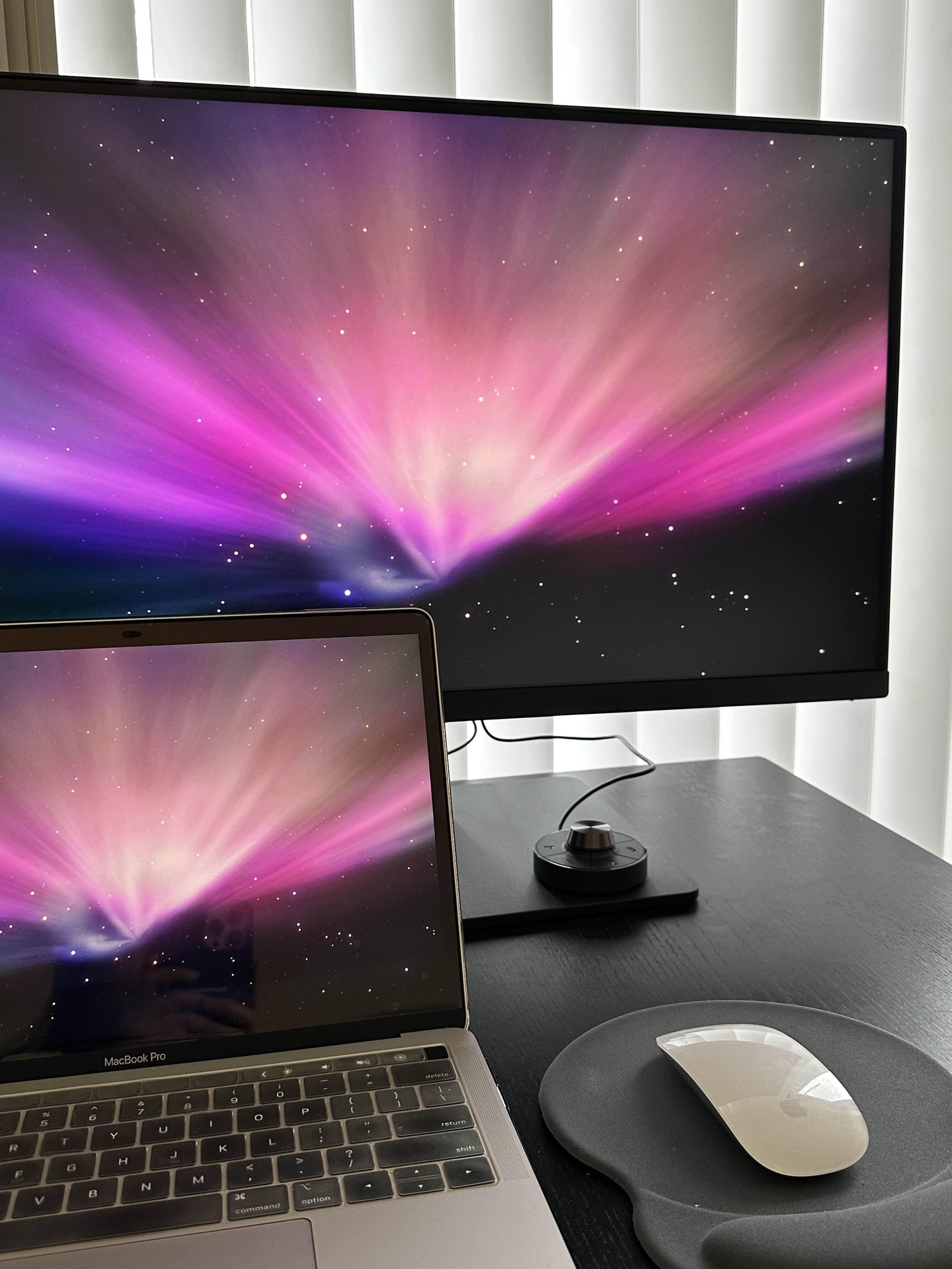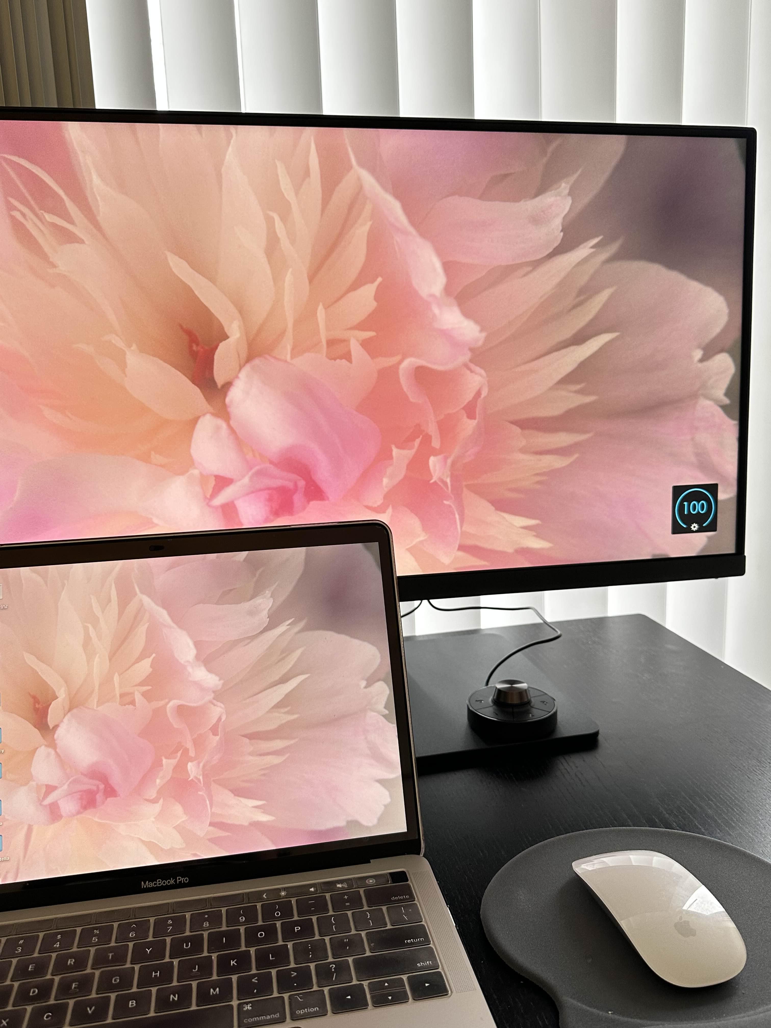 컬러 확인하려고 배경화면 이것저것 바꿔가며 한번 찍어봤어요 :-) 모니터 정면에서 보면 벤큐 로고도 없고 디자인이 깔끔한 게 정말 마음에 들더라구요. 화면 모드도 맥 모드나 로우 블루라이트 모드 등으로 쉽게 바꿔가면서 써봤는데, 확실히 큰 모니터임에도 불구하고 장시간 사용해도 눈이 피로하지 않았어요.