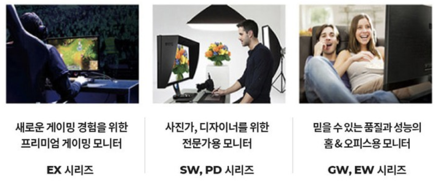 참고로 게임 모니터로도 인기가 많더라구요? 저는 전혀 몰라서 처음엔 BenQ, 27인치로만 검색해서 찾아보다가 나중에 맥북이랑 쓰려면 4K는 되야한다는 글을 봐서 4K도 추가해서 검색해보고, 한국어로 나온 벤큐 시리즈별 설명이 나와있어서 고민없이 PD 시리즈로 골랐습니다.