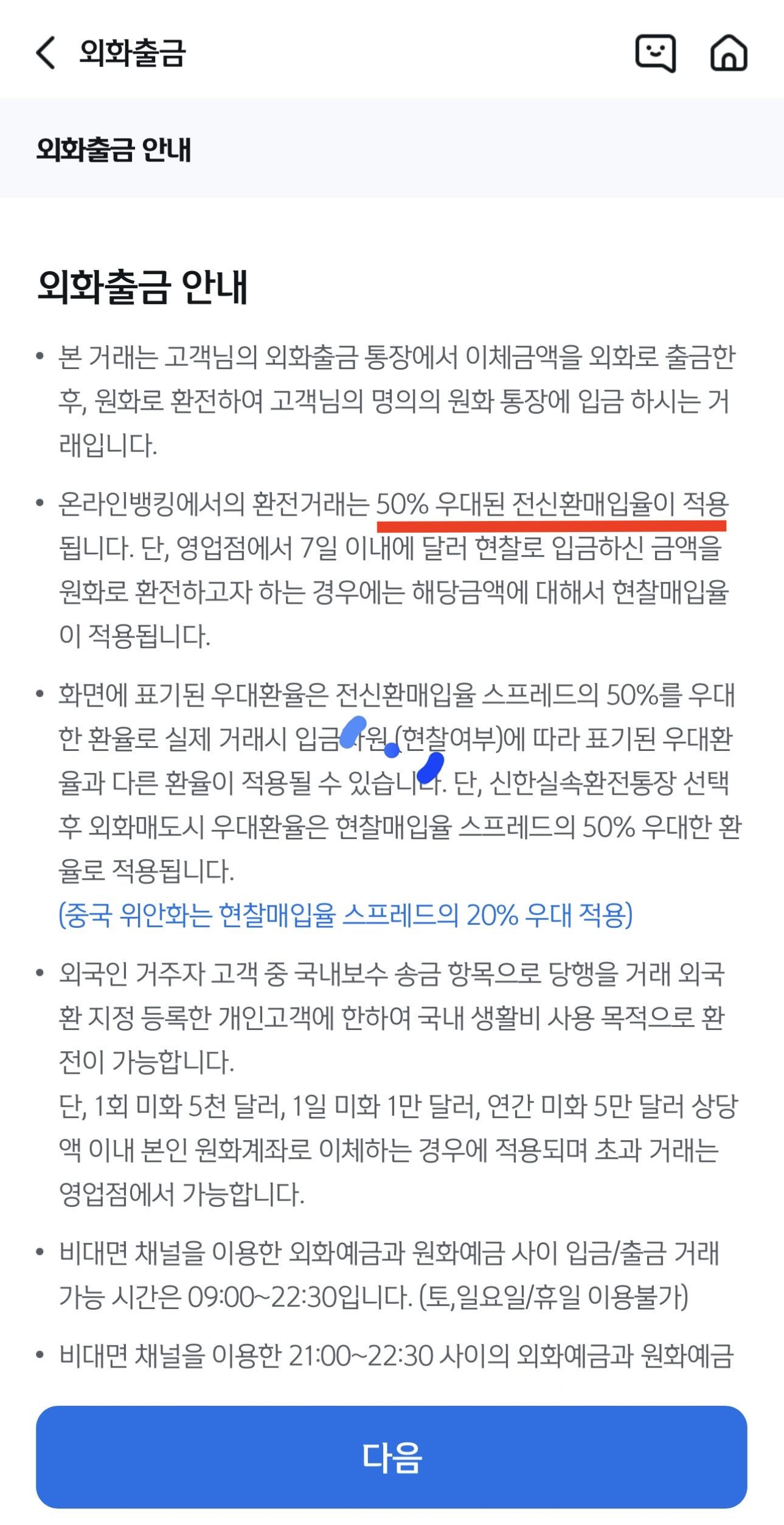 다른 은행도 같은지는 모르겠지만, 신한은행은 온라인뱅킹에서의 환전거래는 자동으로 50% 우대된 전신환매입율이 적용되네요!