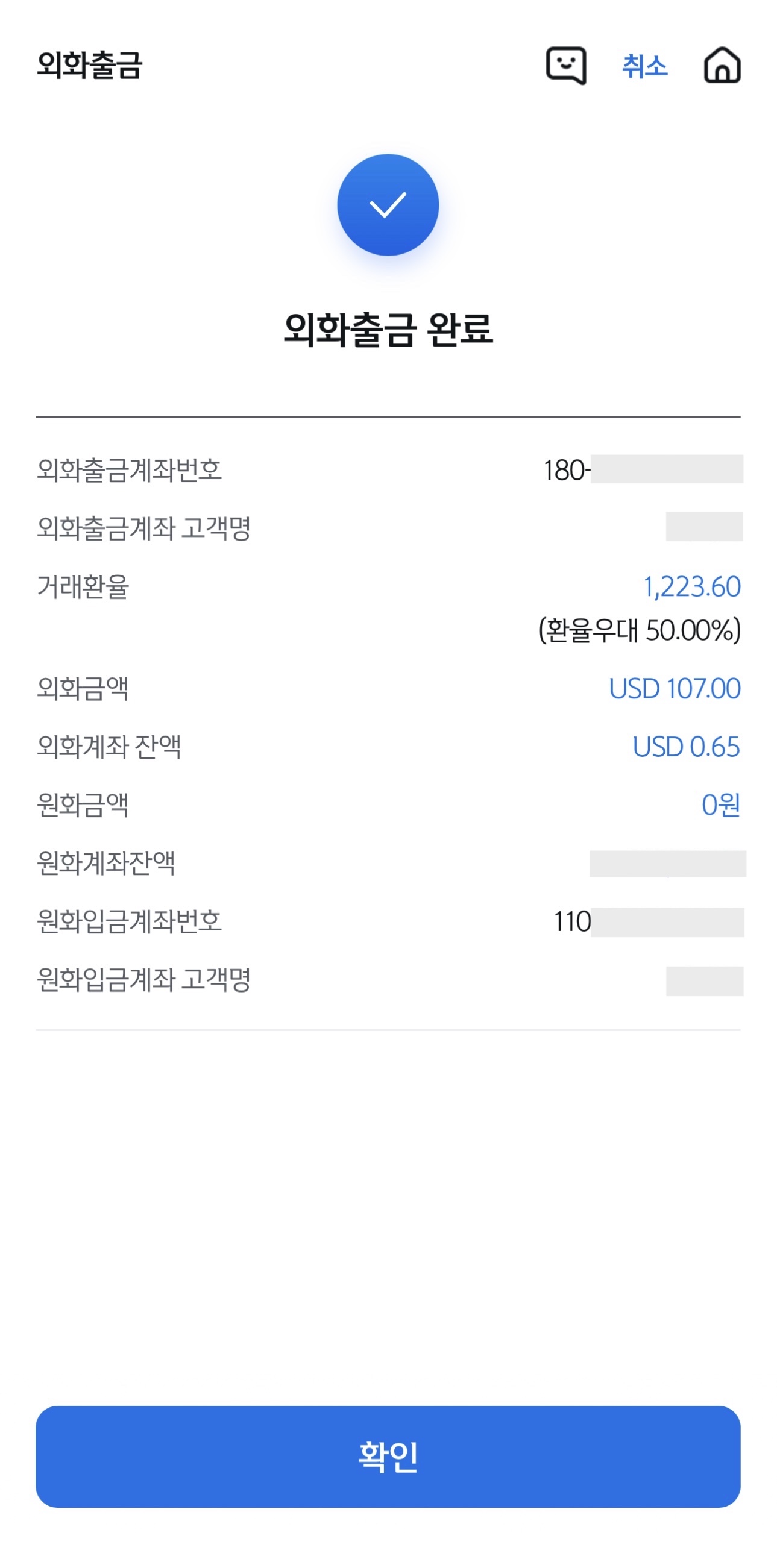 그렇게 마지막으로 확인 버튼을 누르면 외화출금계좌, 거래 환율, 환전된 외화 금액과 잔액, 환전 후 입금되는 원화금액과 해당 계좌 잔액까지 한번에 확인하실 수 있어요.