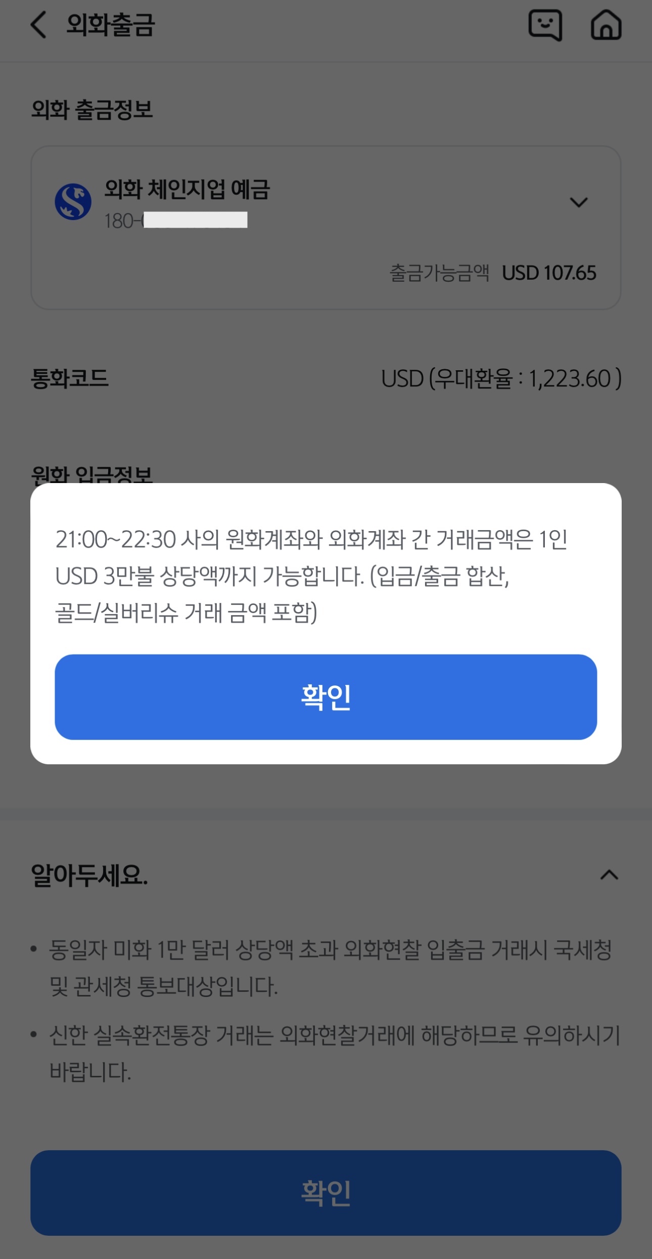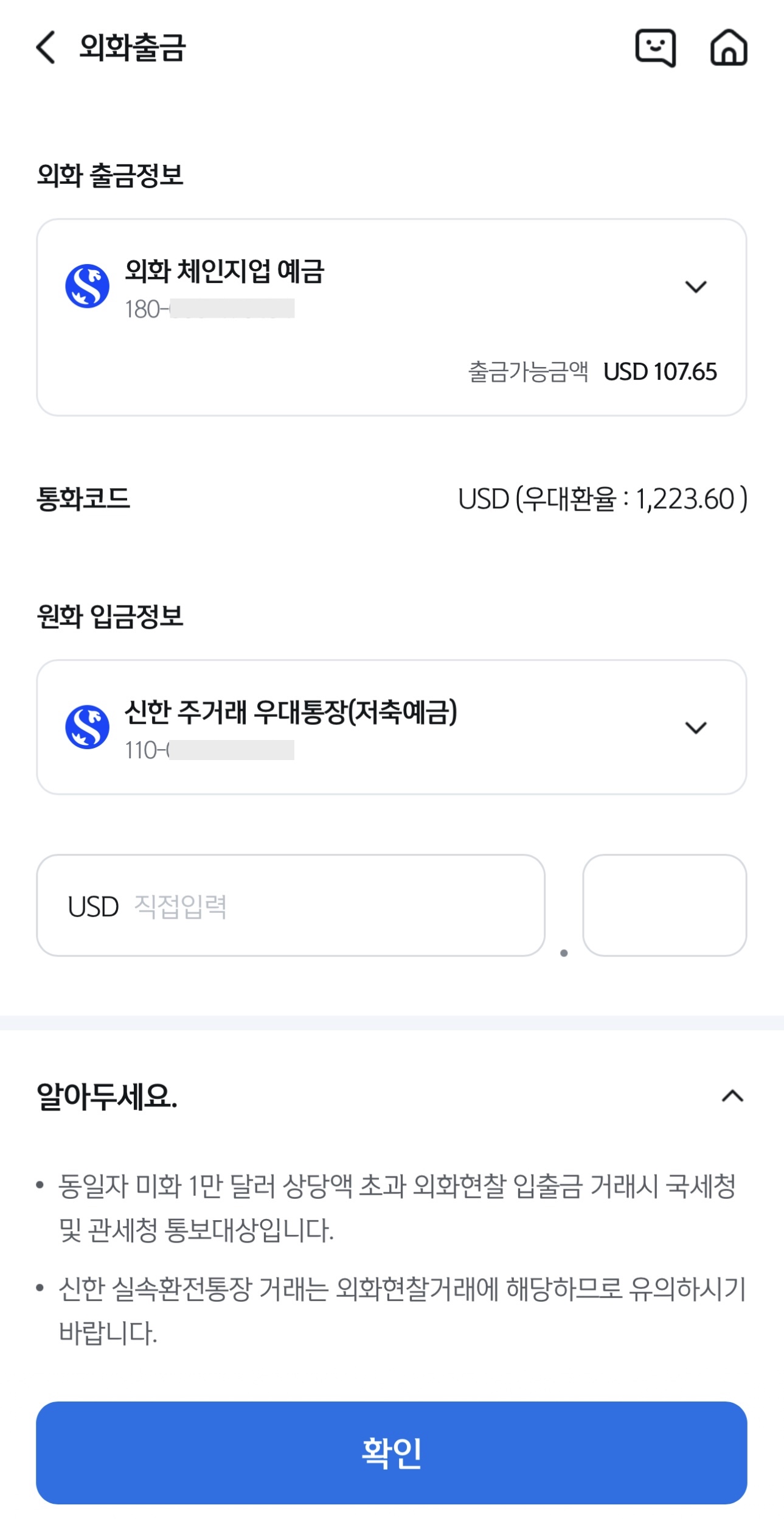 어려운 건 없구요, 해당 외화계좌에서 USD 얼마를 출금하고 싶은지, 일반 계좌가 여러개 있다면 그 중 넣고 싶은 계좌를 선택하여 금액을 직접 입력하면 됩니다. 50% 우대된 오늘의 적용 환율은 달러당 1,223.60원이었습니다.
