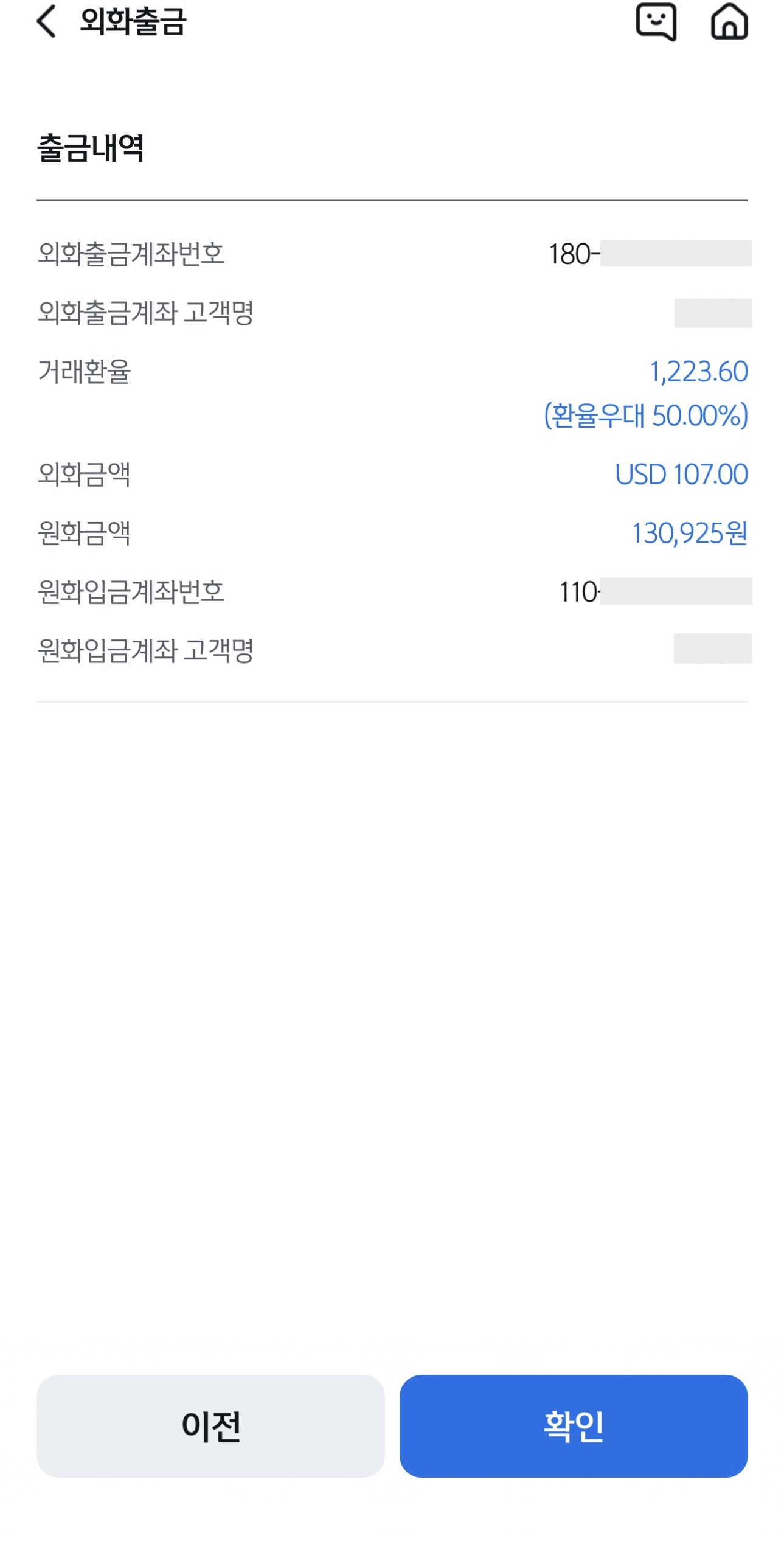 이렇게 출금 내역을 입력하고 나면 바로 확인하는 창이 나오는데, 이 때 원화금액으로 얼마가 입금될지 보실 수 있어요. 저는 USD 107달러를 출금했고, 50% 환율우대가 적용된 후 원화 입금 예정 금액은 130,925원으로 나왔습니다. 나쁘지 않죠?