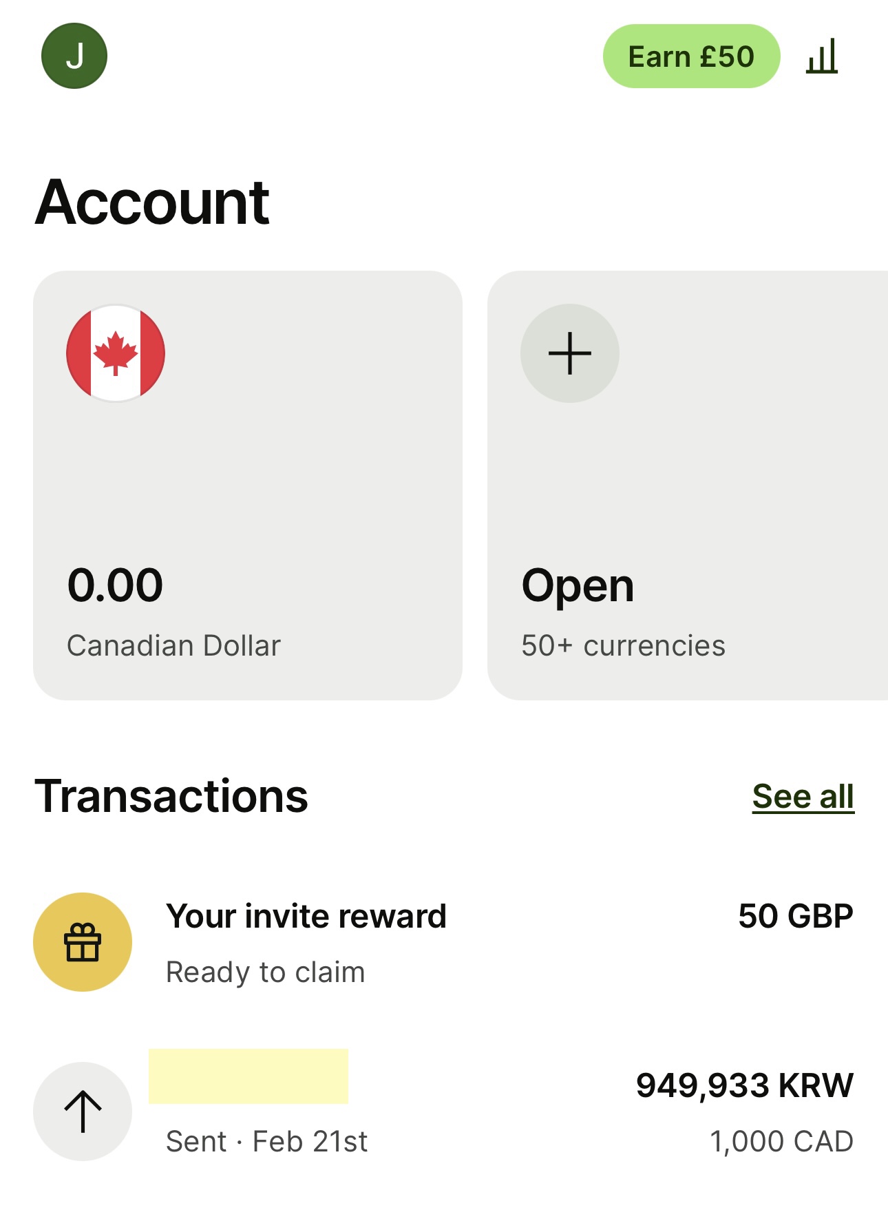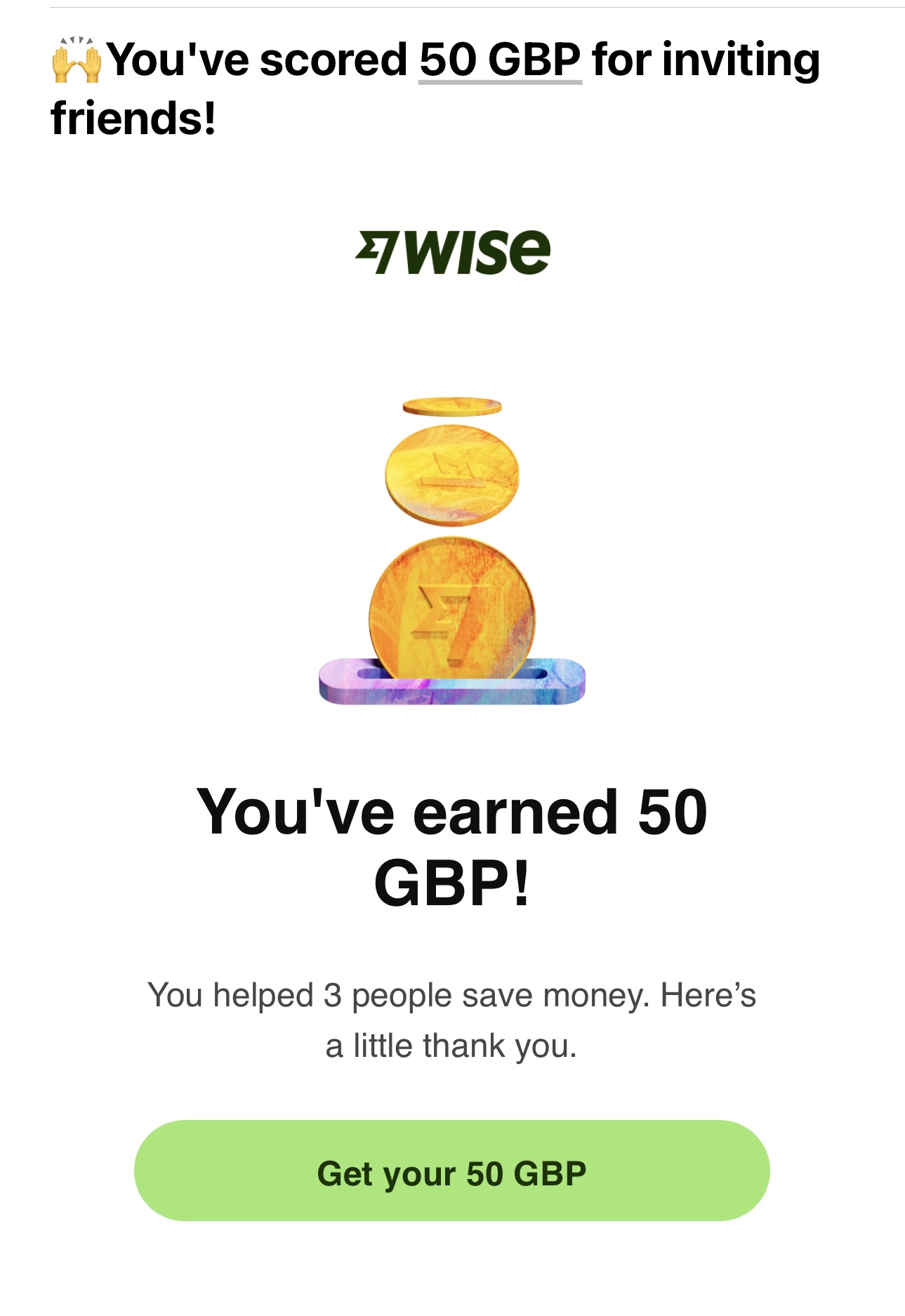 지난주에 Wise에서 메일이 와있길래 열어봤더니, 3분이 제 추천인 코드로 가입 후 해외송금까지 완료해주셔서 50GBP(영국 파운드) 를 클레임할 수 있다는 기쁜 소식이!
