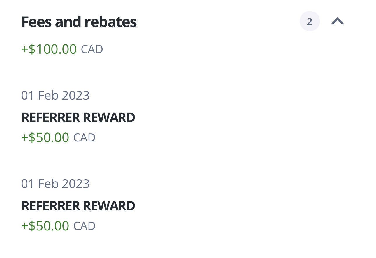 어느날 Questrade 앱을 열어봤더니 2023년 1월에 추천인 코드로 가입해주신 분들이 두분 계셔서 2월에 50불*2 총 100불 리워드가 들어와있었어요!! 제 추천인 코드 써서 가입해주신 분들 감사합니다 :)