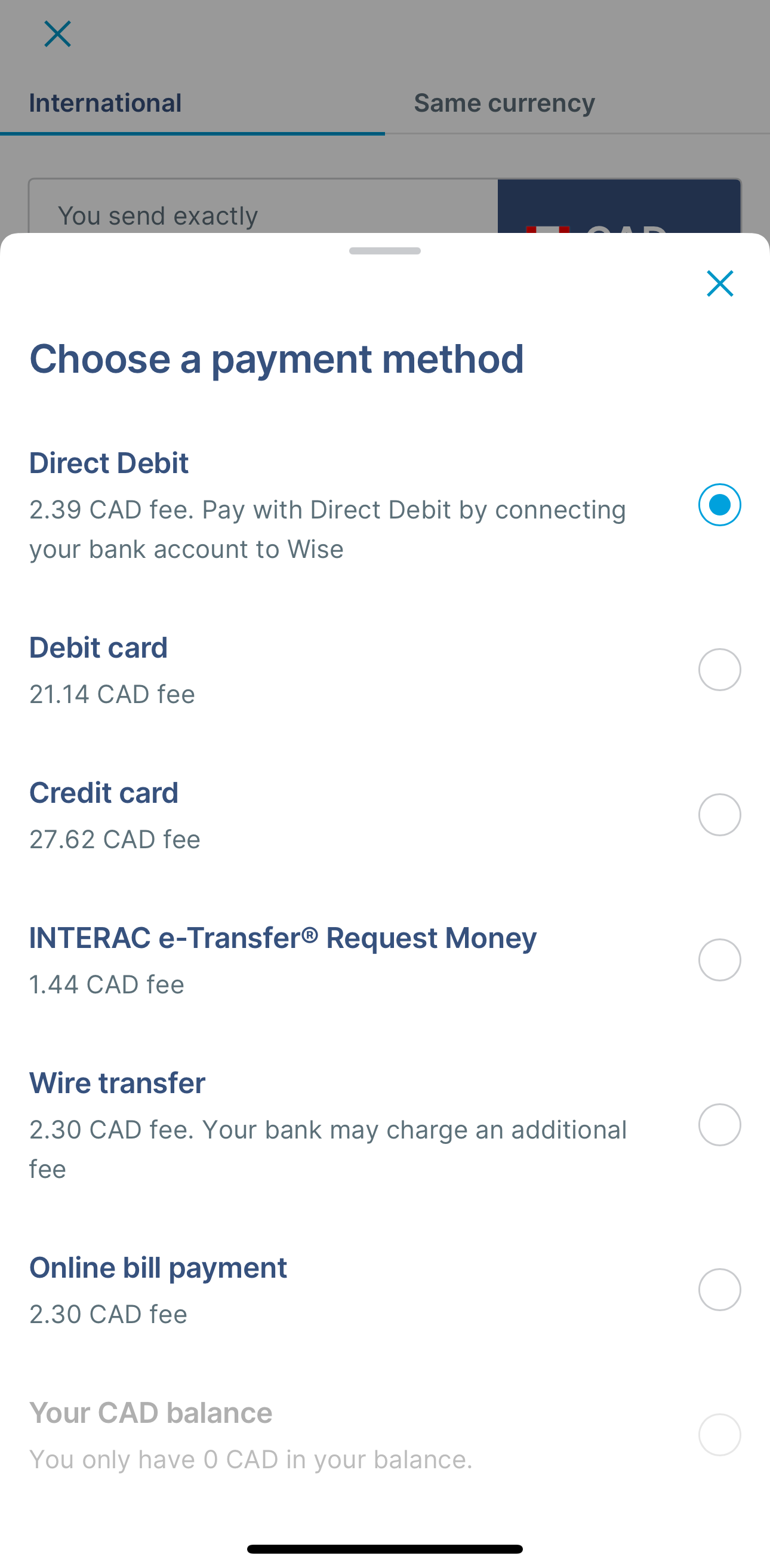 게다가 이렇게 payment method에 따라 각각의 수수료를 비교해가며 선택할 수 있어서 좋은 것 같아요. 참고로 저는 보통 수수료가 제일 저렴한 옵션으로 골라요. 처음엔 혹시 2-3일씩 걸리면 어떡하나 걱정되서 가장 빠른 method로 선택했었는데, 거의 3분 안에 입금이 확인되구요, 시간이 좀 걸린다고 나오는 INTERAC e-Transfer도 어차피 길어봤자 당일날 몇 시간 안으로는 다 들어오더라구요!