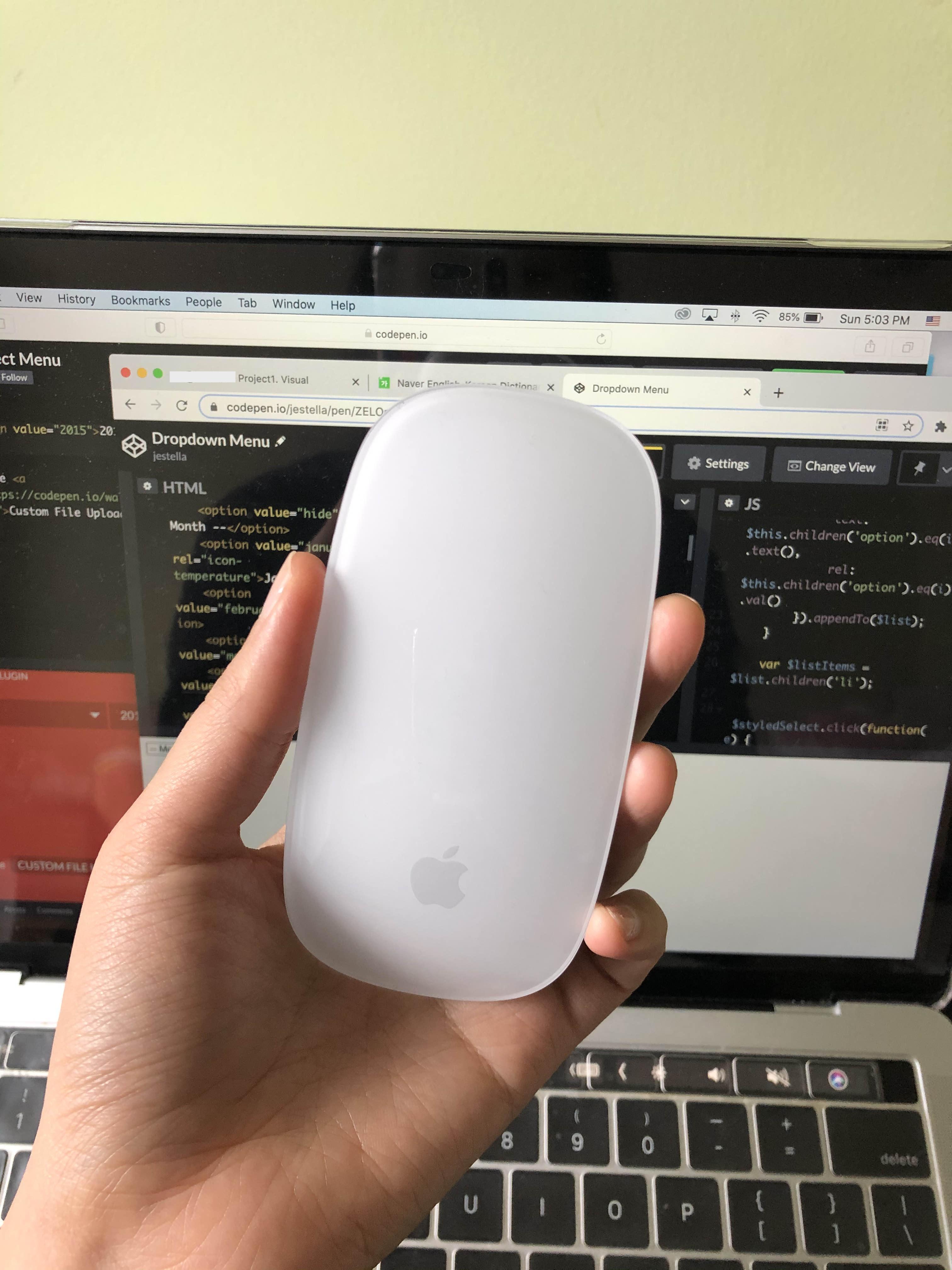 그러다 코딩공부를 시작하고 나서 오랫동안 온라인 강의를 틀어놓고 같이 프로젝트를 만들다 보면 맥북 자체에서 열이 올라와서 그대로 손가락 끝에 전해지는 그 기분을 참 못견디겠더라구요 (노트북으로 오랫동안 작업하시는 분들 비슷한 경험 많이들 하시죠?;;). 그래서 어떤 마우스가 좋을지 친구들에게도 물어보고 검색도 많이 해봤는데, 사실 저는 처음부터 제가 그냥 애플 매직마우스로 살 거라는 걸 알고 있었습니다... 나쁜 리뷰들 다 보고 나서도 살 수밖에 없는 건 역시... 디자인이죠.....