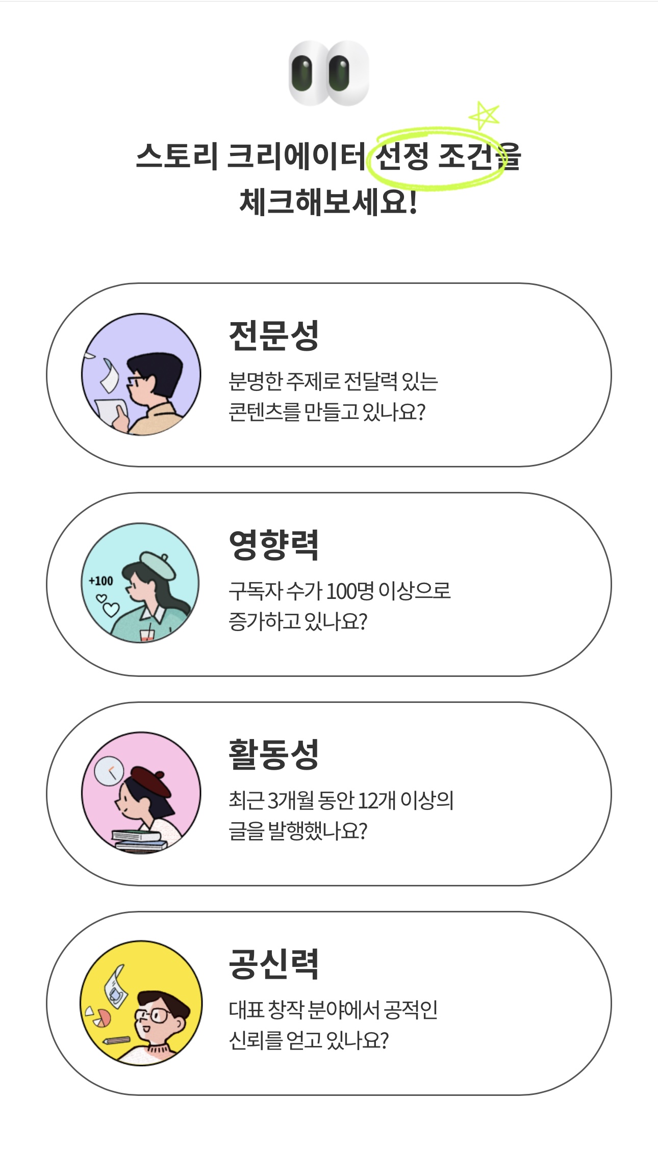 클릭해서 들어가보니 스토리 크리에이터 선정 조건이 구체적으로 나왔구요.