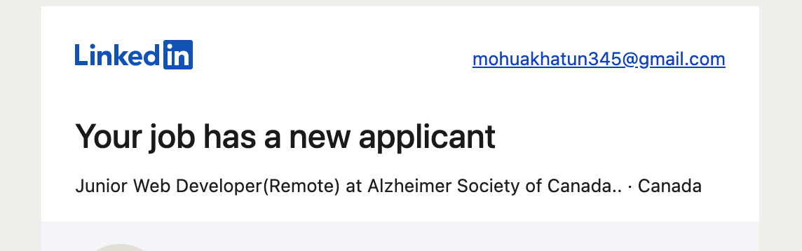 이렇게 Junior Web Developer at Alzheimer Society of Canada라고 나오면서 제 링크드인 프로필과 지원한 이력서까지 함께 첨부해서 메일이 왔더라구요. 워낙 이것저것 많이 와서 이건 그냥 보고 넘겼어요.