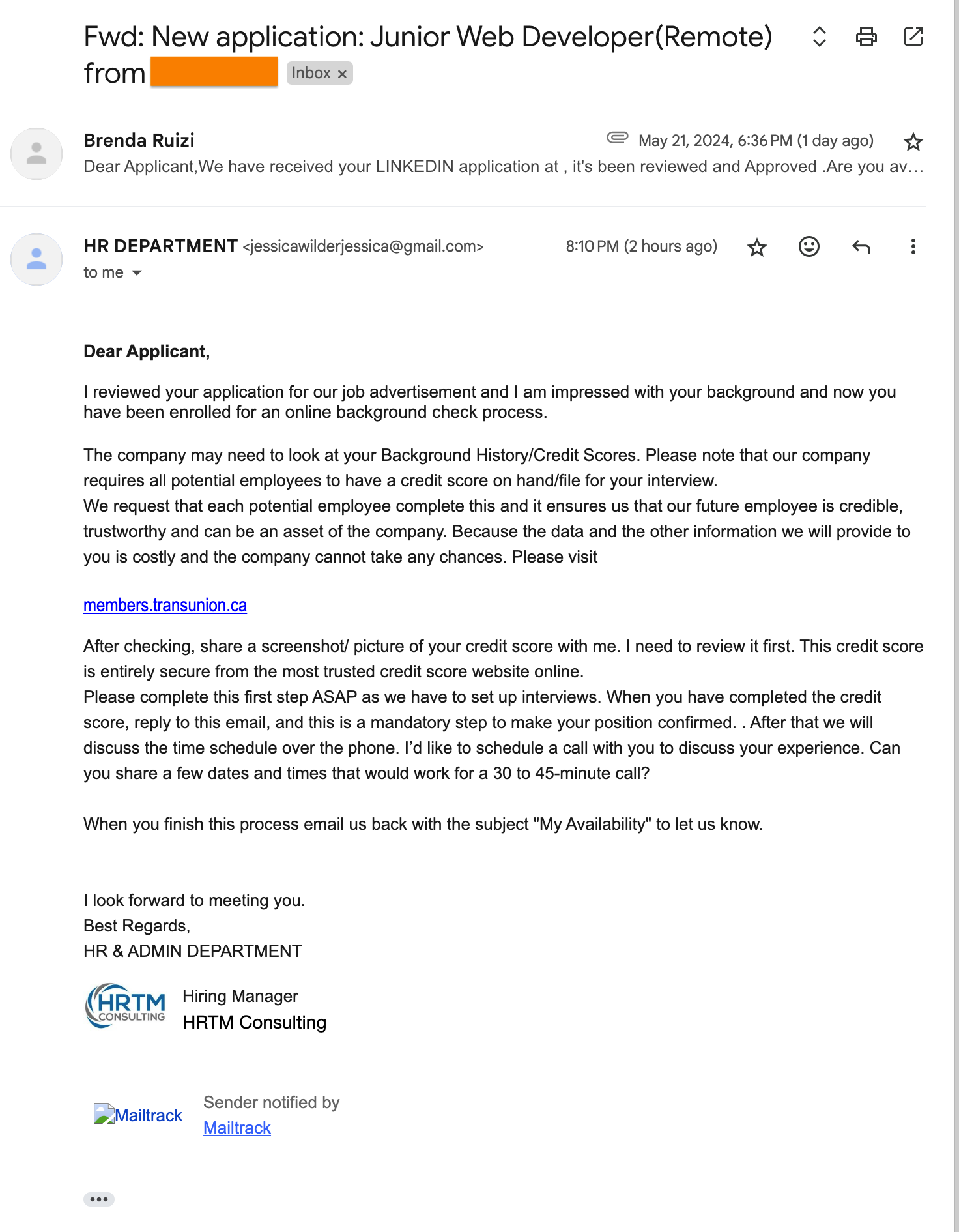- Request for Personal Information: Legitimate employers typically do not ask for credit scores as part of the application process, especially through unsolicited emails. They might conduct background checks after a formal interview process and with proper authorization forms.