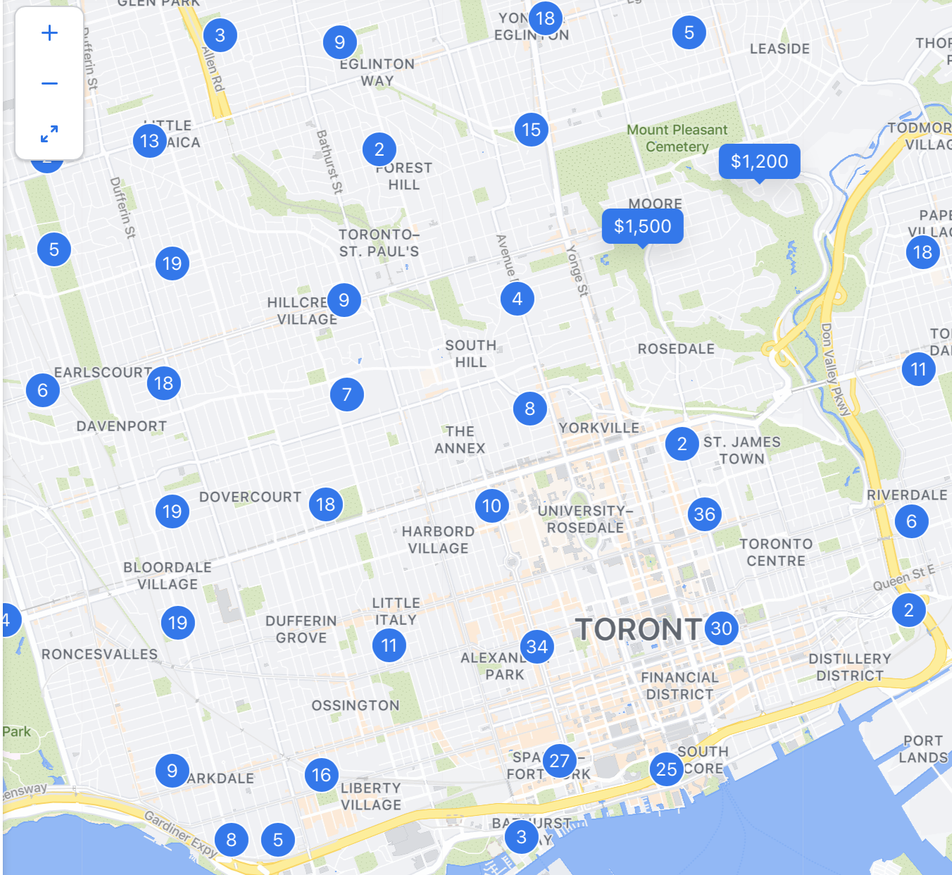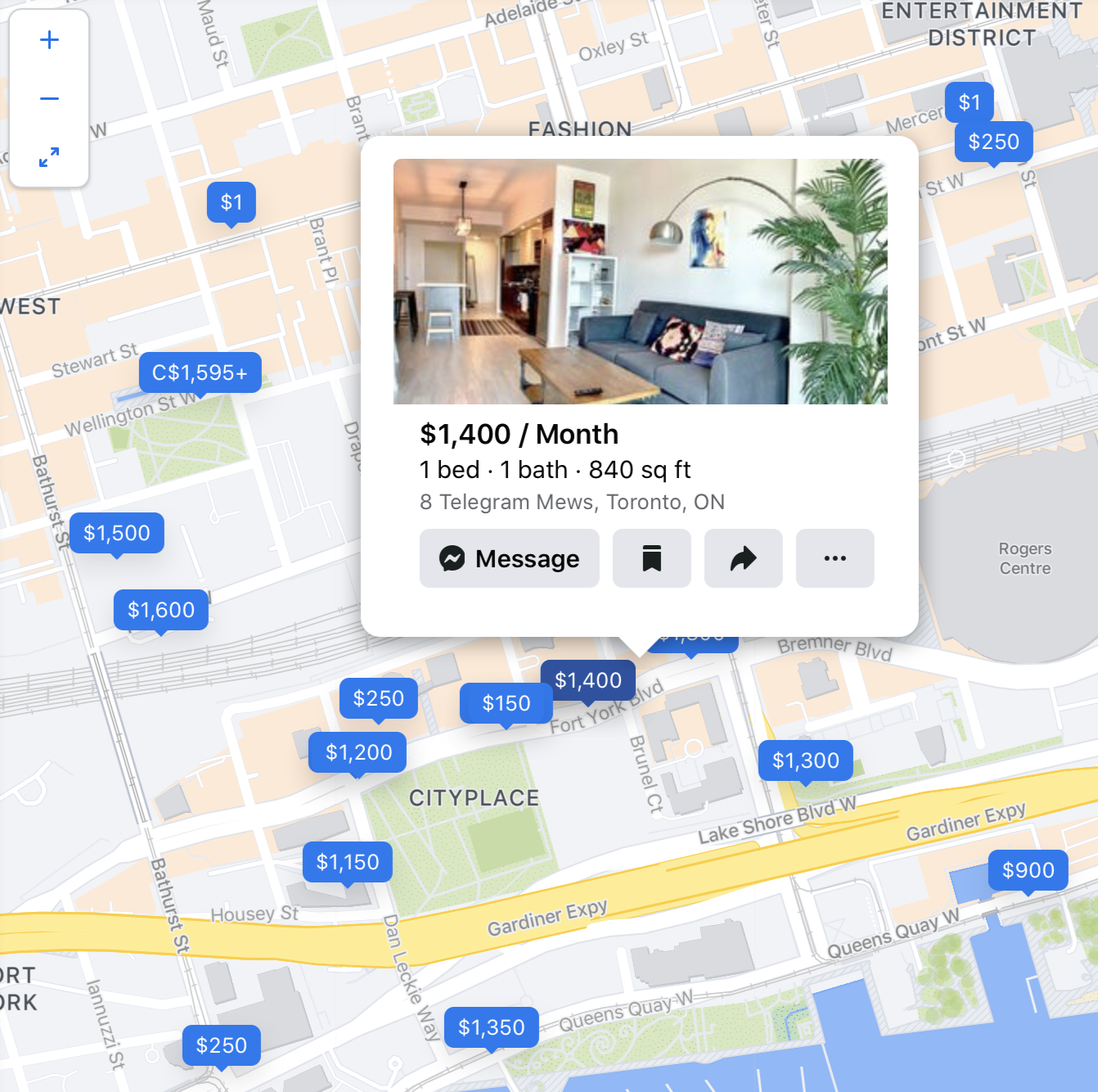 지도 사이즈를 확대해서 크게 만들면 정확하게 렌트비가 나오고, 클릭하면 렌트비, 방 개수, 크기, 주소가 나와요.
