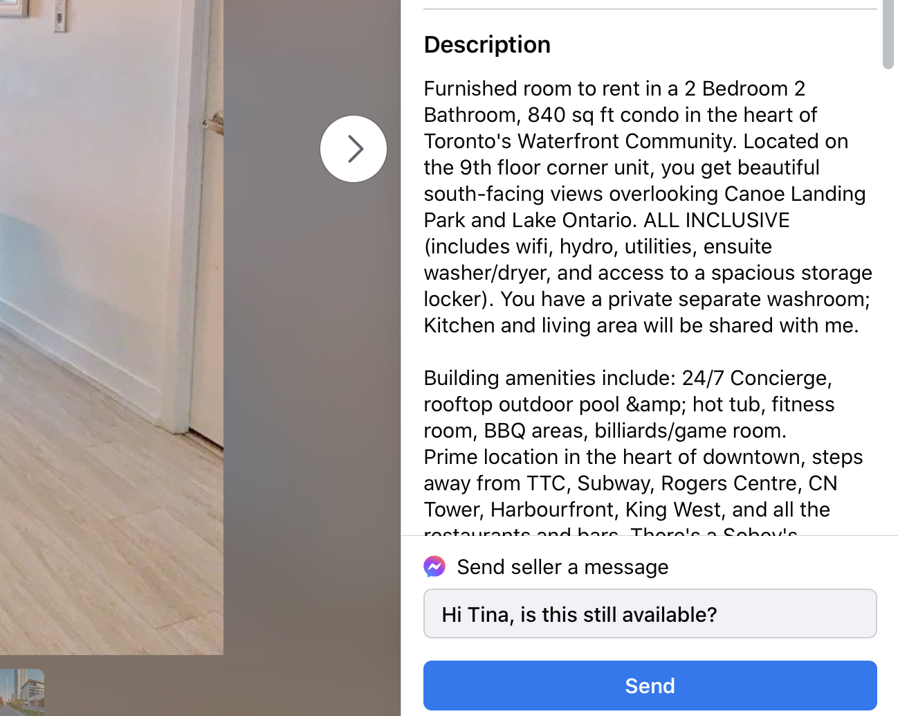 Description 부분을 꼭 자세히 읽어보세요. 아무래도 원배드룸 콘도인데 렌트비가 저렴하다 싶어서 자세히 봤더니 이렇게 2 배드룸에 룸메 한 명을 구한다는 정보가 나오죠? 생각보다 전체 렌트가 아닌 방 하나만 렌트하는 글도 많답니다. 연락하시기 전에 꼭 정확한 렌트 정보를 확인하신 후 연락하시길 추천드려요.