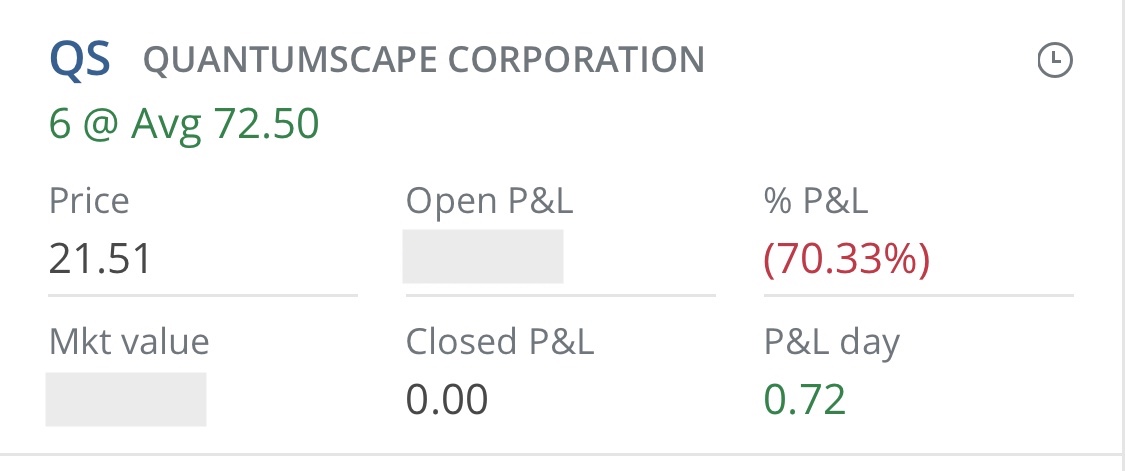 그래서 원래부터 주식을 잘 알지는 못했지만 초반에 나름의 신념을 가지고 신중하게 골라 담던 스타일을 버리고, 친구가 몇 백 프로 수익을 냈다는 주식들을 지켜보다가 조금 하락했다 싶을 때 사들였어요. 바로 Plug Power, FuelCell, QuantumScape입니다 ^^;;; (가지고 계신 분들 많이 답답하시죠? 끙... 저두요ㅎㅎㅎ)