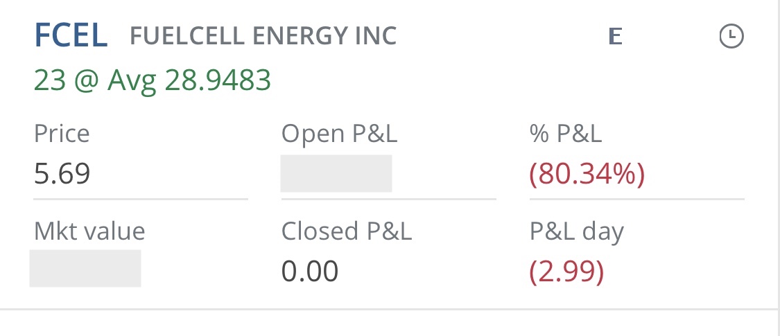 FuelCell은 더해요 이건 뭐 최고가인 거의 29불때 매수했는데, 현재 5.69불로 수익률 -80.34%