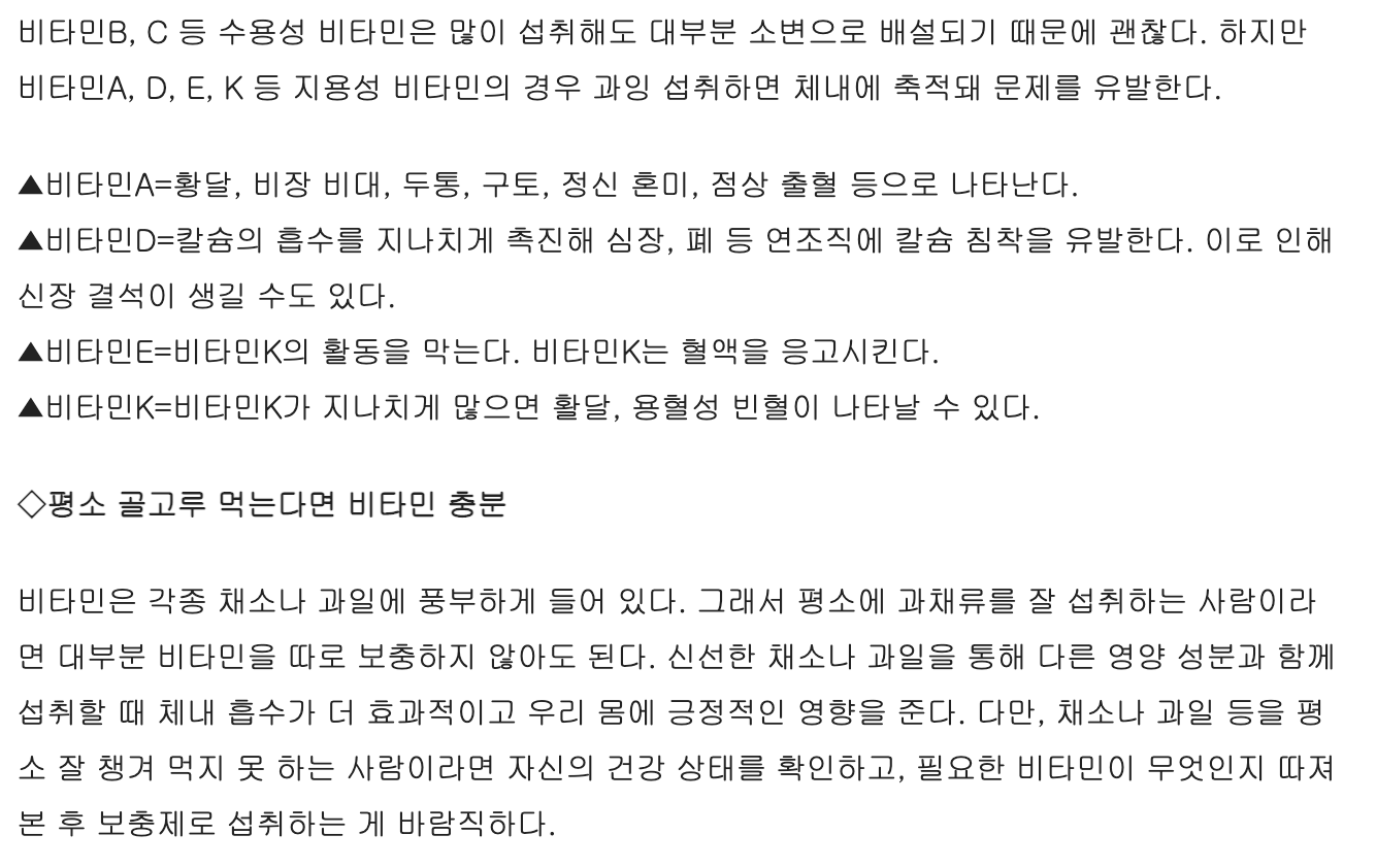물론 한국에 있다 보면 홈쇼핑 같은 곳에서 판매를 위해 꼭 섭취를 해야 한다! 해외에서는 겨울엔 필수로 비타민D를 따로 섭취한다! 등등 귀에 솔깃한 얘기로 구매를 유도하지만, 비타민은 본인이 부족한 것만 선택해서 섭취하면 되기 때문에, 불필요하게 영양제로 따로 섭취하는 것은 오히려 과다 섭취로 몸에 해로울 수도 있으니까요. 혹시 본인이 햇볕 한 점 들지 않는 공간에서 겨울을 보내야 한다면 절대적으로 햇볕을 받는 양이 부족하니 비타민D를 따로 섭취하는 게 좋겠지만, 일반적으로 외출을 하며 생활을 하시는 한국에 사시는 분들은 평소에 충분한 햇볕을 받기 때문에 그것만으로도 충분하다는 게 제 개인적인 의견입니다 :)