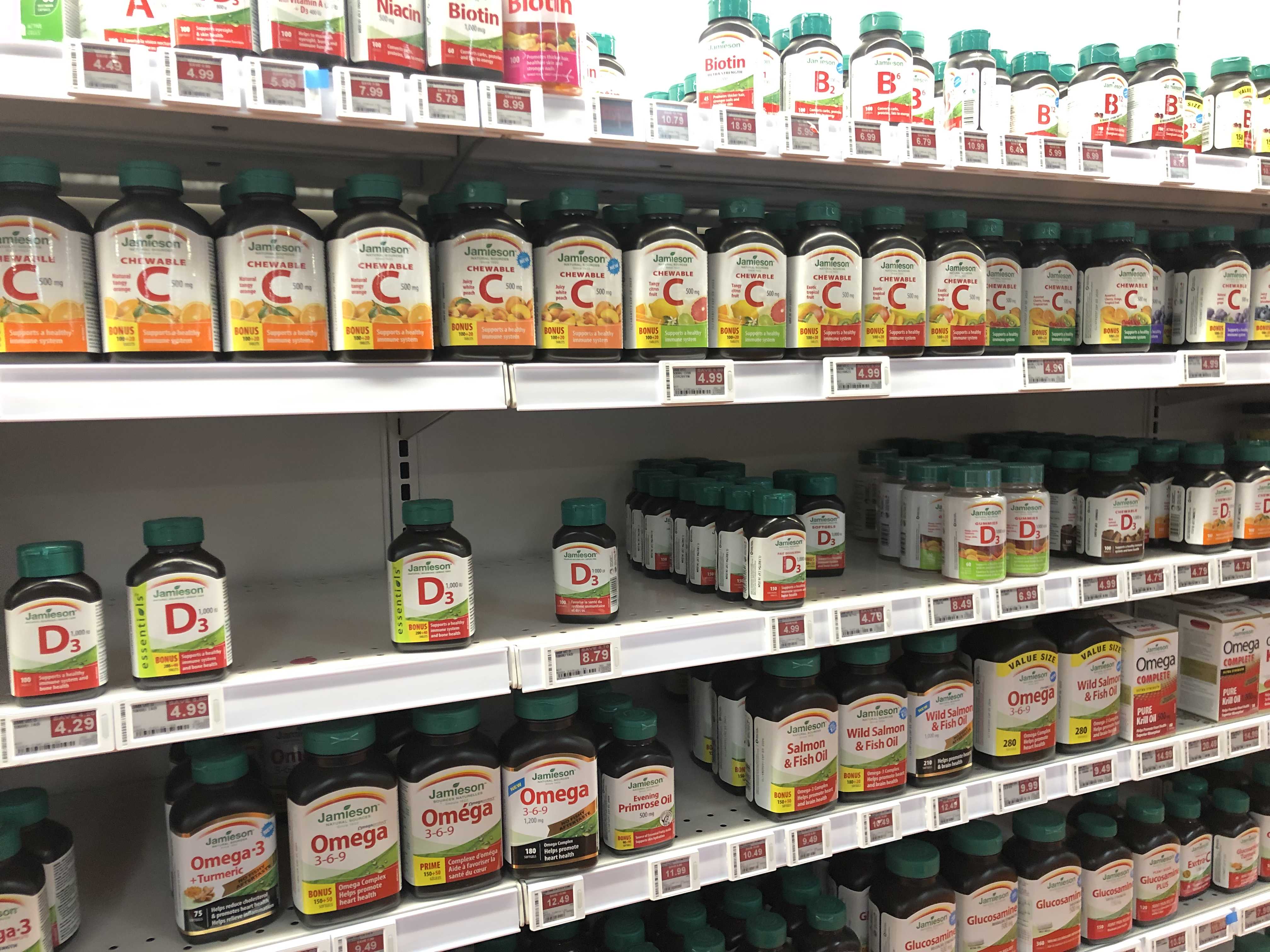 한국 사시는 분들에게 캐나다는 비타민, 영양제의 천국이라는 이미지가 있을 것 같아서, 궁금하실까봐 집 근처 마트에 사러 갔을 때 찍어뒀어요. 이건 Jamieson 브랜드가 진열된 선반만 찍은 거고, 이런 식으로 브랜드 별로 알파벳 순서에 맞게 진열되어 있답니다. 비타민류는 Jamieson이 종류도 가장 다양하고, 선반 자리도 많이 차지하고, (아마) 캐네디언들도 가장 선호하는 브랜드라 그런 게 아닌가 합니다.