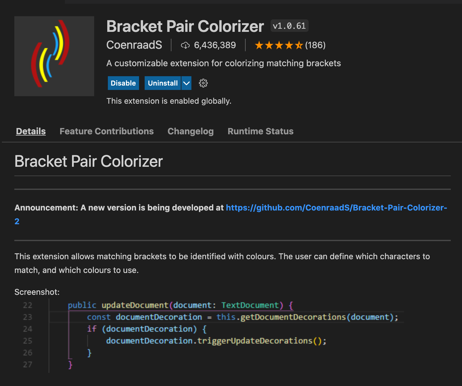 이건 이번 강의를 통해 처음 설치하게 된 extension 입니다. 코딩을 하다보면 (). {}, [] 등의 괄호가 너무 많이 쓰이기 때문에 제대로 닫았는지(?) 어느 괄호가 어디서부터 시작된건지? 등 헷갈릴 때가 많아요. 이 Bracket Pair Colorizer가 매치되는 괄호에 따라 색을 바꿔주기 때문에 눈으로 확인하기가 훨씬 쉬워질 것 같네요.