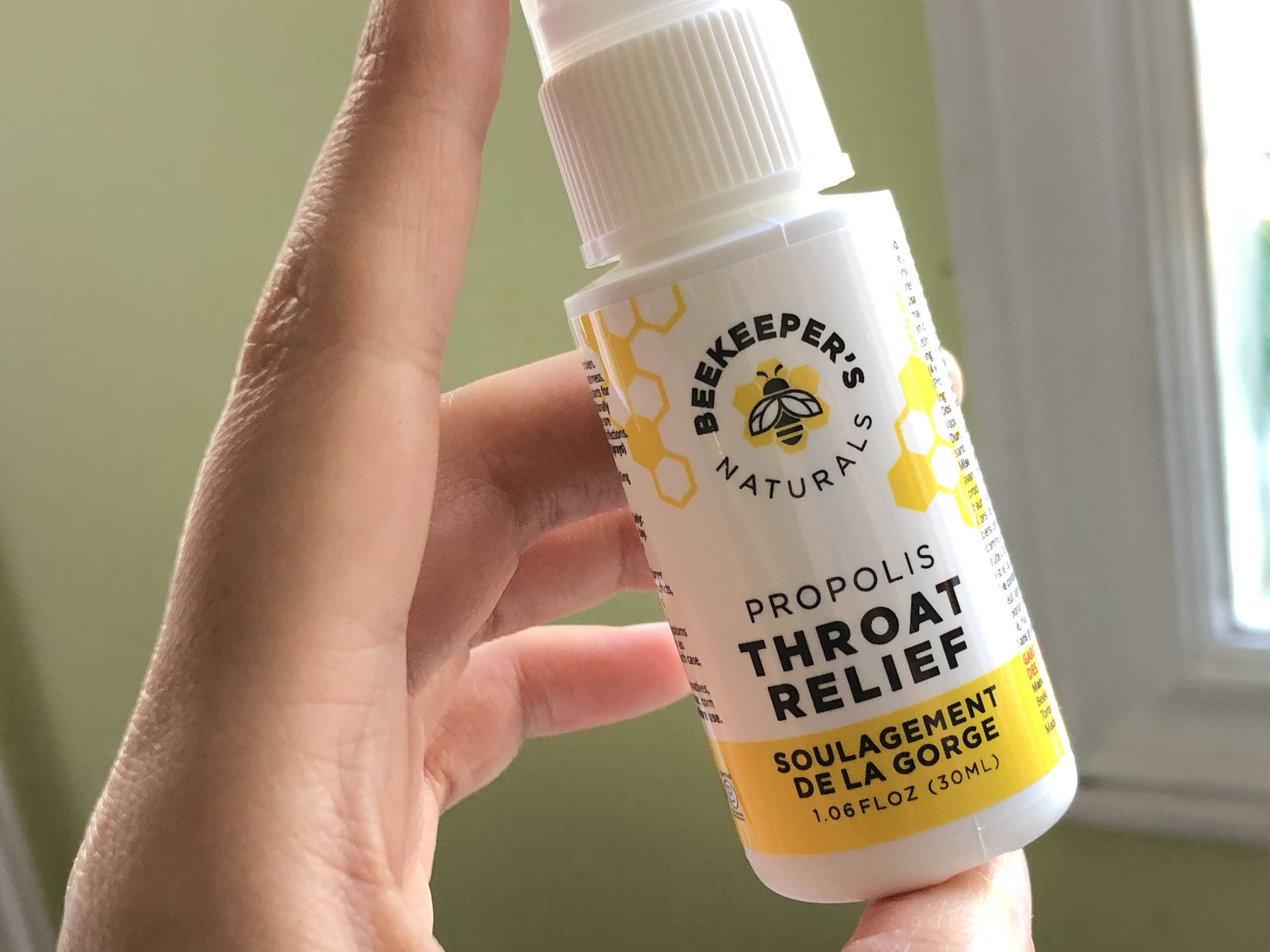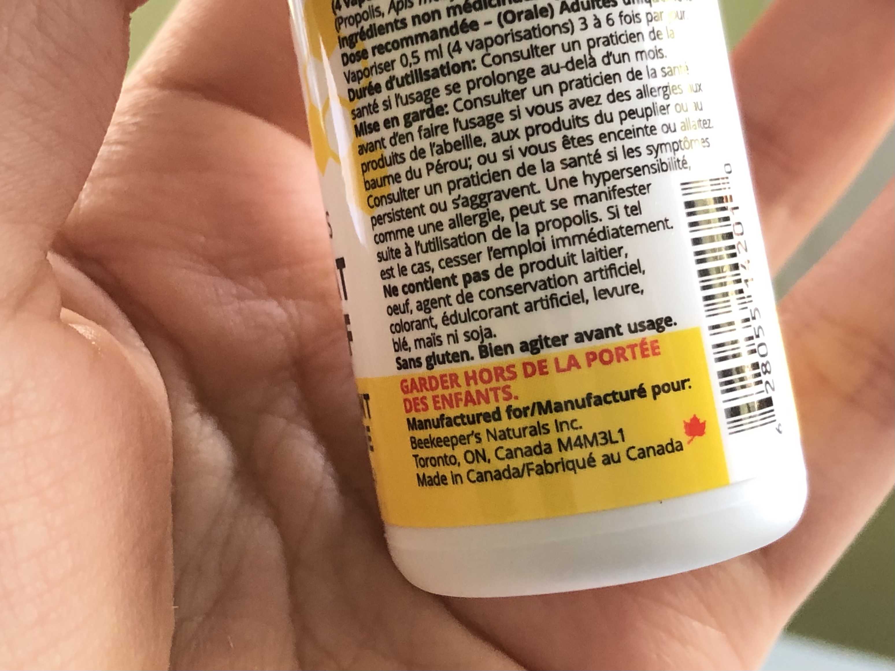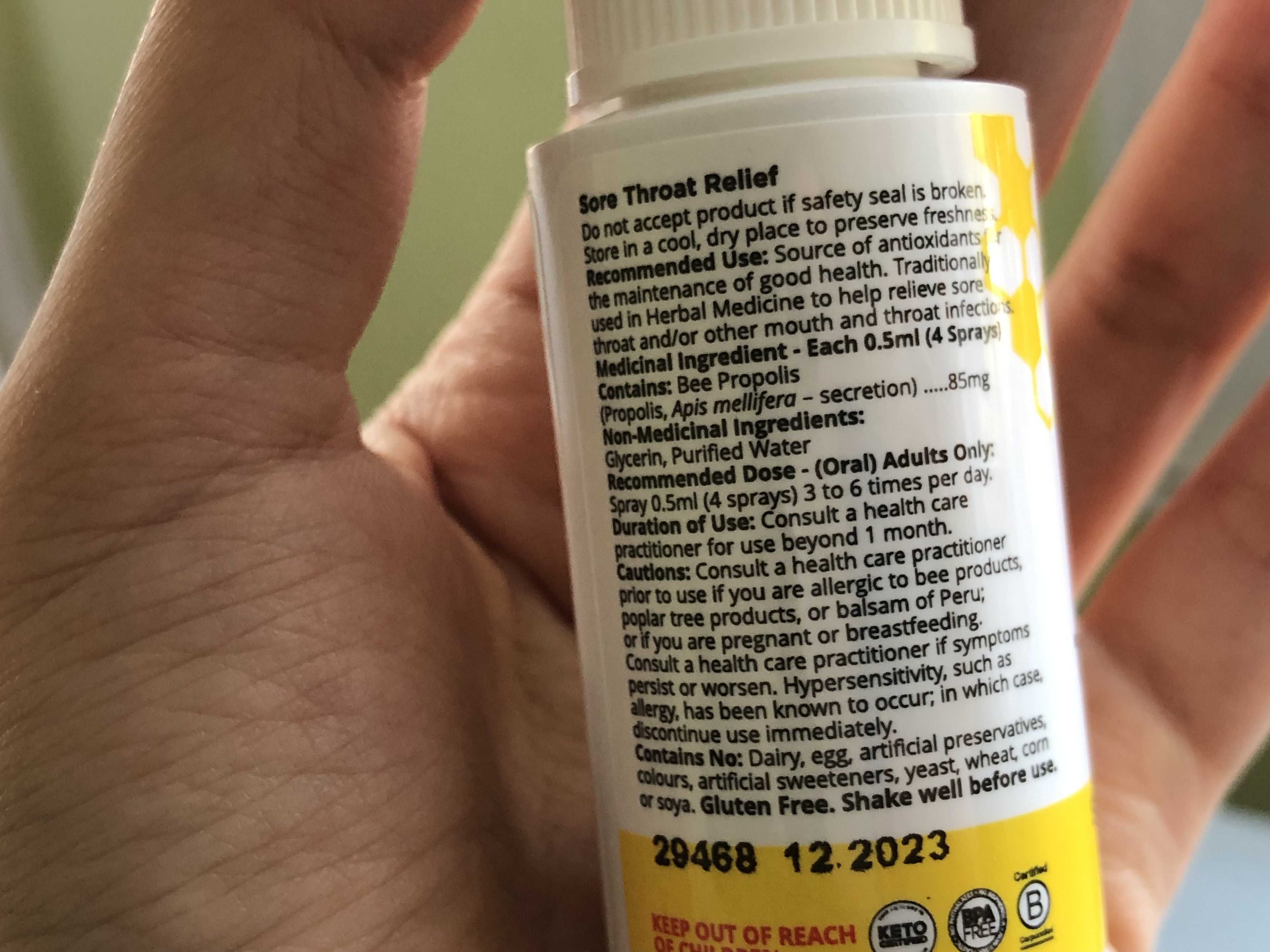 하루 꼬박 앓고 나서 사온 Beekeeper's Naturals 프로폴리스 인후 스프레이. 올해 초에 한국에서 호주산 인후 스프레이를 사오려다가 품절이라 못 사 왔는데, 검색해보니 캐나다에도 별점 4.7의 유명한 Beekeeper's Naturals라는 브랜드가 있더라구요!! 집 근처 비타민 & 영양제 전문점에 들러서 바로 사 왔습니다. 파는 분 말로는 어린이도 함께 사용할 수 있다는 프로폴리스 인후 스프레이.