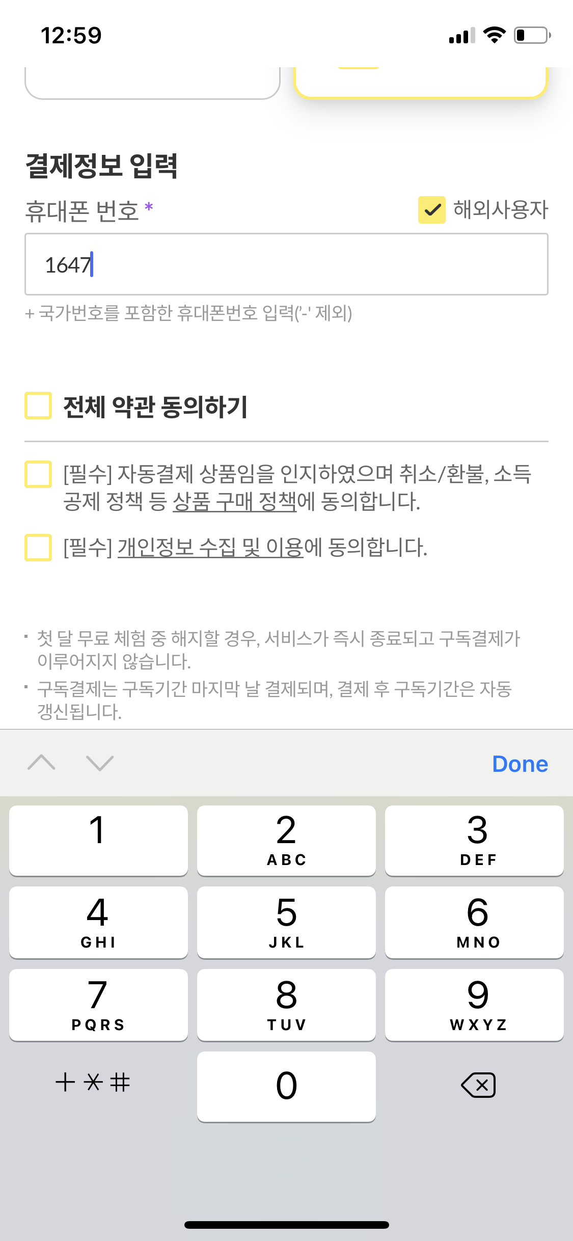 해외에서 밀리의 서재 구독하고 싶으신 분들은 이렇게 결제정보란에 해외사용자를 체크하시고 해당 국가의 핸드폰 번호를 넣으면 됩니다.