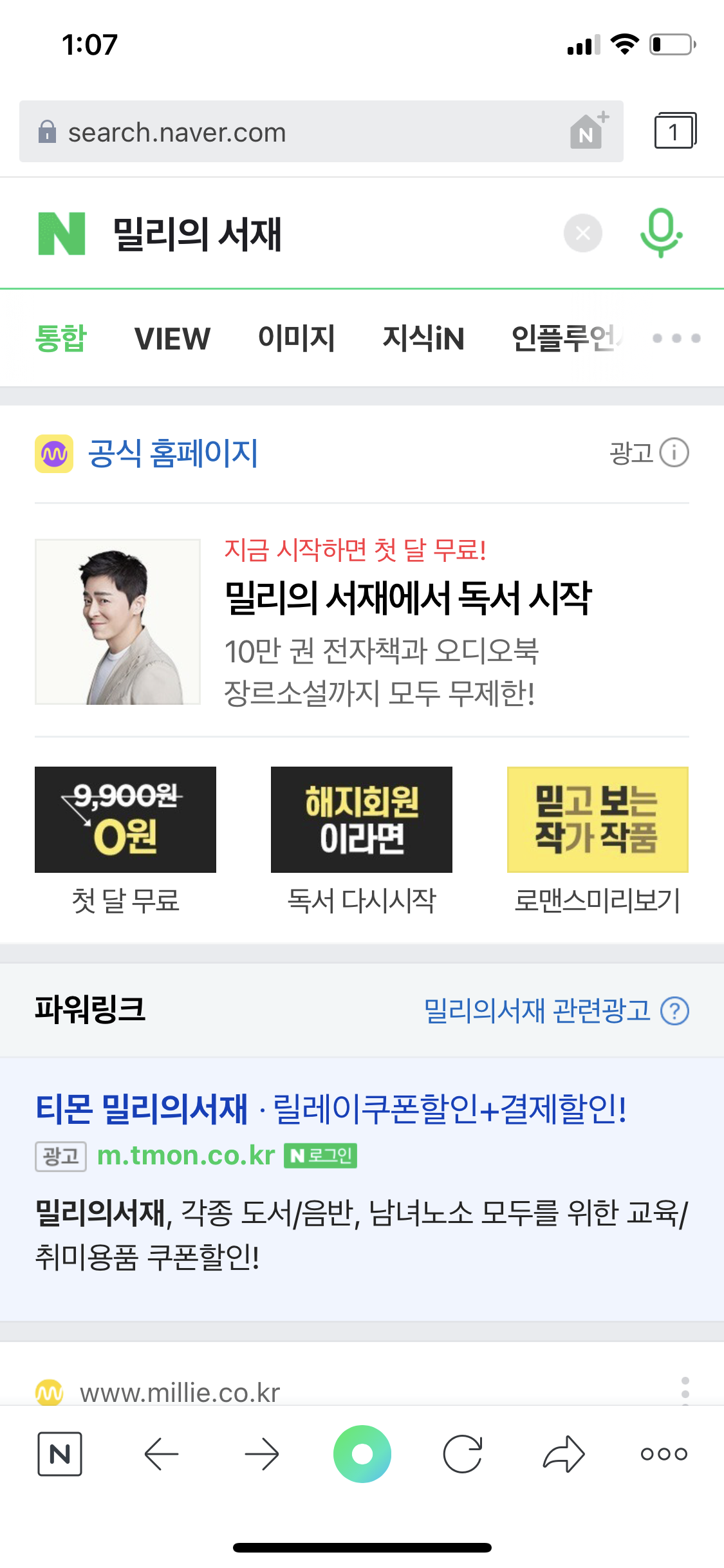 네이버로 검색해서 뜨는 광고 페이지로 들어가기. 밀리의 서재 앱으로 미리 회원가입을 해두셨더라도 괜찮아요! 구독권 결제하러 들어가는 걸 그냥 네이버 화면으로 접속하기만 하면 되는거라.