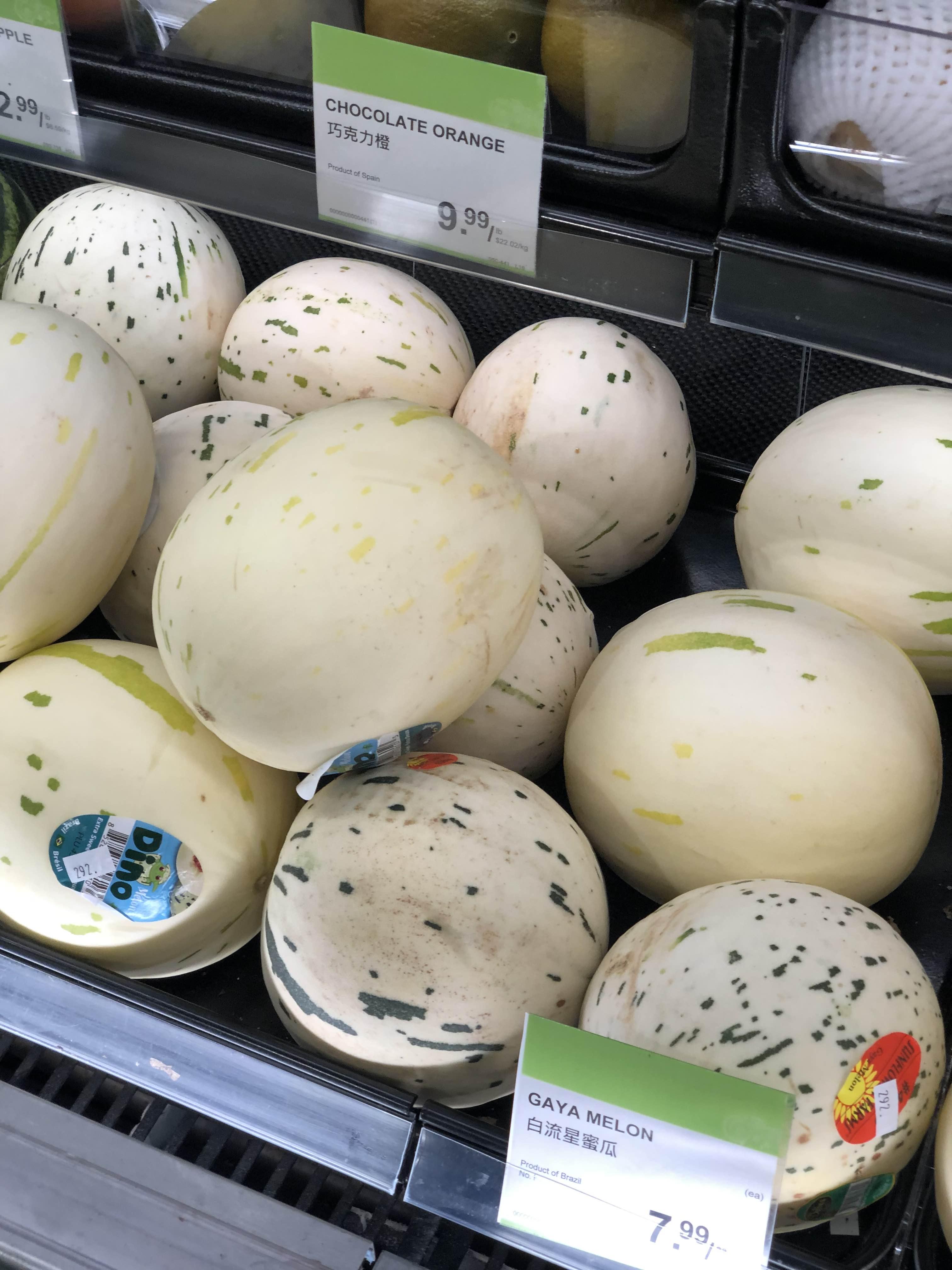 gaya melon. 가야 멜론 혹은 snowball melon, ghost melon, dinosaur melon, dinosaur egg melon, dino melon 등의 이름으로 불리기도 한다고 해요. 공룡 멜론, 공룡 알 멜론이라니 이름부터 귀엽네요. 이것도 사오고 싶었지만 뚜벅이 신세라...