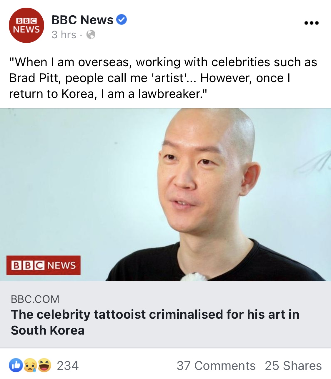 해외에서는 브래드 피트 같은 유명인들도 찾을 만큼 유명한 타투이스트가 한국에서는 범죄좌 취급을 받는다는 기사가 BBC에 떴네요! 캐나다에서도 타투는 하나의 예술로 인정받고 있는데 말이죠...;;