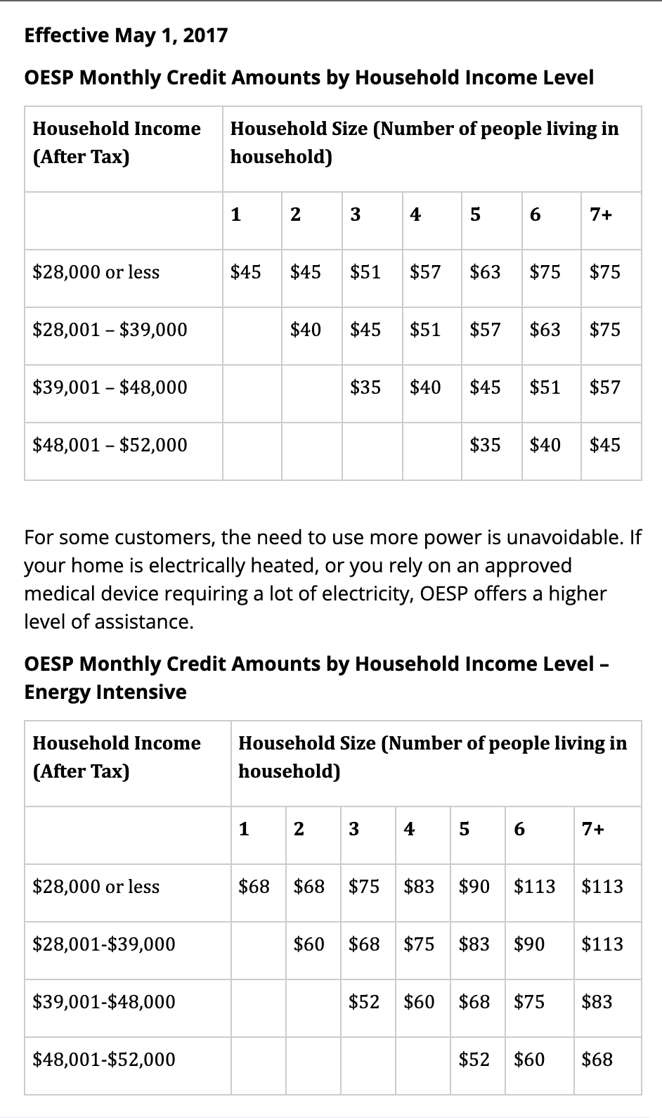 한 집에 거주 중인 인원수에 따라 지원금은 월 $45 - $75로 다르고, 또 집에서 의료용 장비를 사용해야 하는지 등에 따라 $68 - $113로 지원금이 다릅니다. 상단에 있는 테이블이 일반 가정이고, 하단 테이블이 의료용 장비나 특수한 상황으로 전기를 더 많이 쓰는 가정에 지원되는 인원수에 따른 지원금입니다.