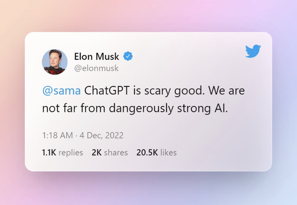 참고로 지난달 일론 머스크는 트위터를 통해 "챗GPT는 무서울 정도로 굉장하다. 우리는 위험할 정도로 강한 인공지능에 가까이 와있다." 라는 코멘트를 남겼습니다.