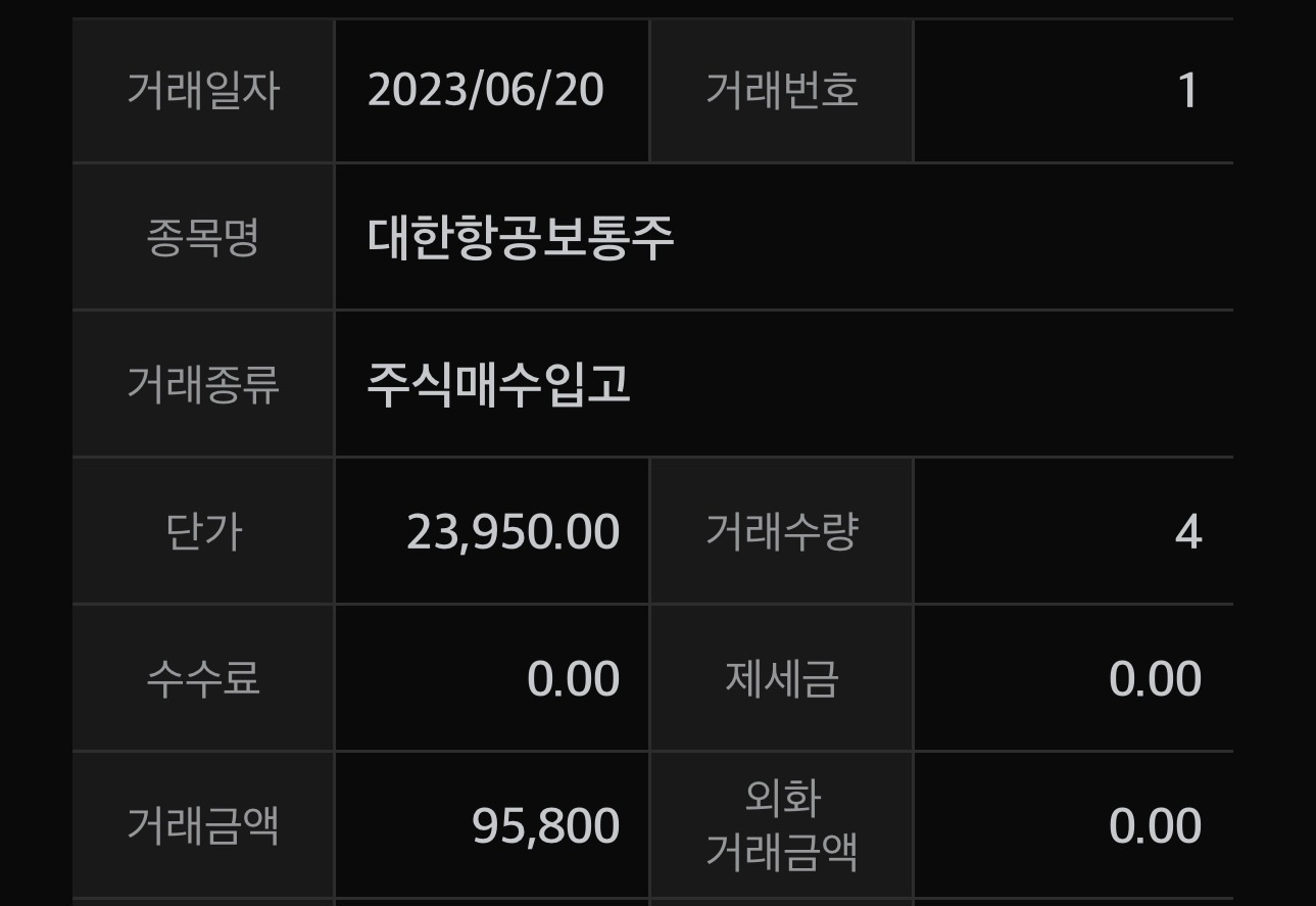 현재 제가 가진 대한항공주 수익률이 -30%를 딱 넘어섰길래 기념으로... 4주, 이후 +4주 해서 이달 총 8주 추가 매수했습니다. 다들 멀리할 때 혼자 꿋꿋이 주워담다보면 해뜰날이 오겠죠?