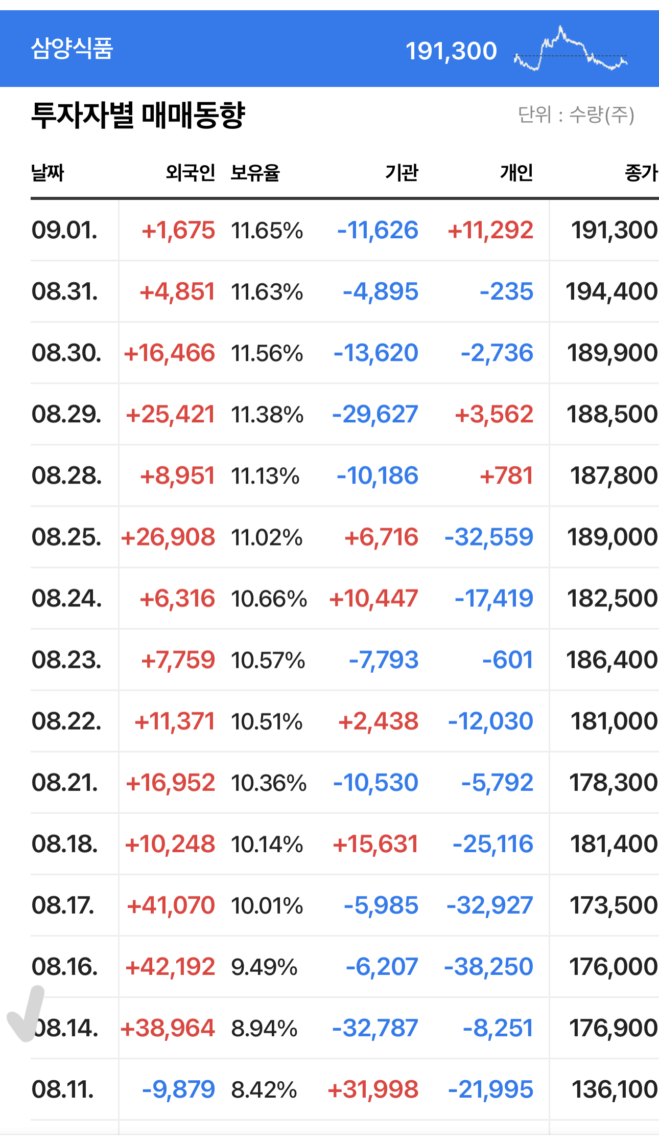 제가 매도한 8월 14일 (금요일) 이 지나고, 그 다음주부터 현재까지도 쭈우우우욱 외국인들이 꾸준히 담고있는 삼양식품;;; 괜히 일찍 매도했나라는 생각이 들기도 하고 계속 가져가고 싶었던 회사라 살짝 아쉽지만 다음에 다시 하락세로 돌아서면 그 때 다시 매수해보려고 합니다!